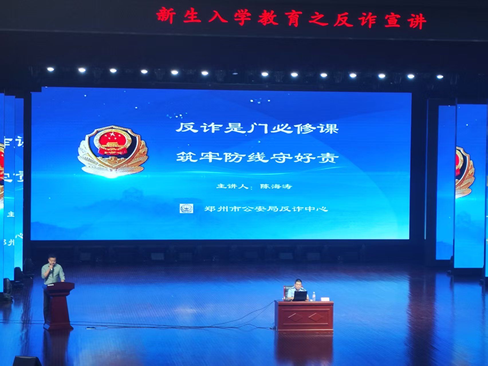 随着电信网络诈骗手段日益隐蔽多样,校园已然成为反诈宣传的重要阵地。2025年9月12日,pp电子在艺术中心连开三场以“反诈是门必修课,筑牢防线守好责”为主题的反诈宣讲会。活动由校党委武装部冯博主持,郑州市公安局反诈支队宣传骨干陈海涛主讲,全体2025级新生参加讲座。