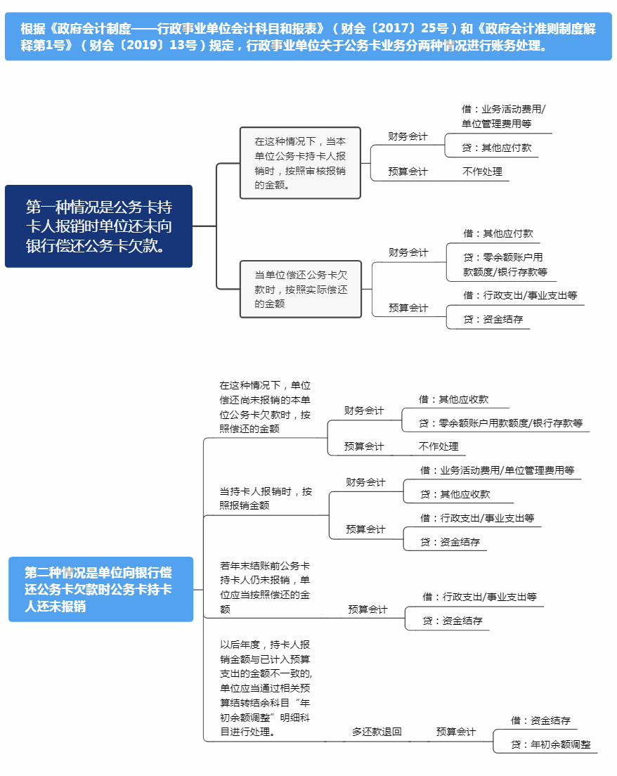 答:根据《政府会计制度—行政事业单位会计科目和报表》(财会〔2017〕25号)和《政府会计准则制度解释第1号》(财会〔2019〕13号)规定,行政事业单位关于公务卡业务分两种情况进行账务处理。
