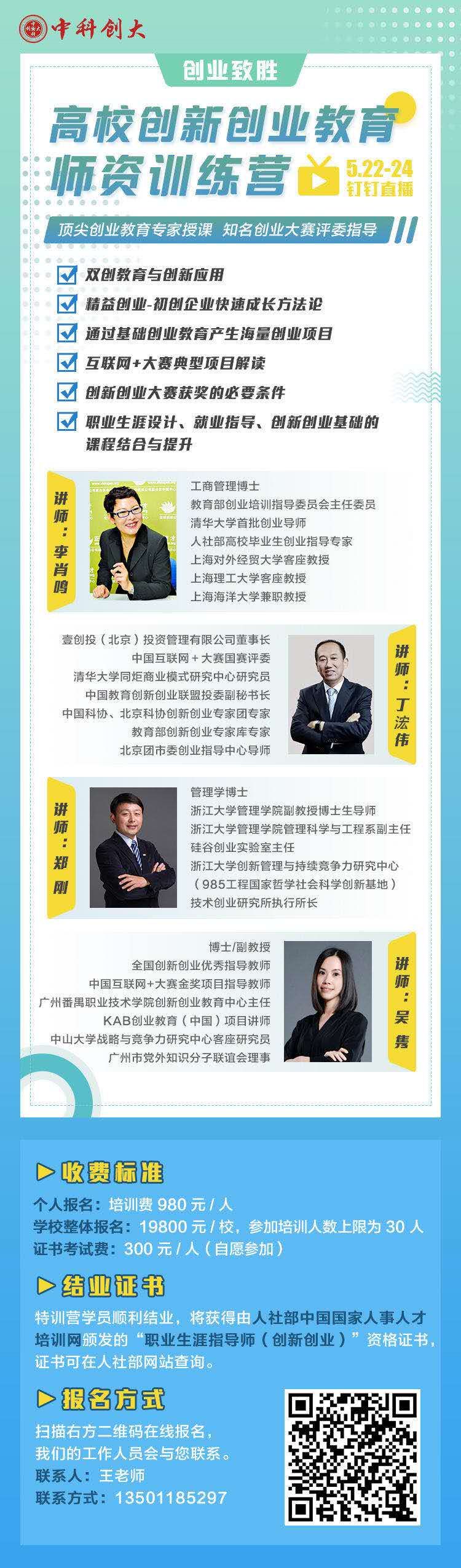 经报校领导同意,我部门拟组织pp电子部分教师参加5月22日-24日中关村中科创新创业教育基金会主办的《创业致胜》高校创新创业教育师资训练营,培训以线上形式开展,完成培训并通过考核结业,颁发“职业生涯指导师(创新创业)”资格证书。经我部门报校领导商定,将参加名额分配给各二级学院,具体分配名额为:旅游管理学院3人、酒店管理学院3人、烹饪食品学院3人、旅游外语学院3人、国际工商学院2人、信息工程学院2人、现代服务学院2人、机电工程学院2人。