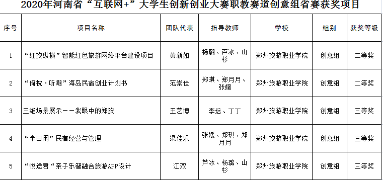 2020年8月18日-27日,2020年河南省 “互联网+”大学生创新创业大赛职教赛道省赛复赛在河南经贸职业学院举行,经过评审,pp电子“‘红旅纵横’智能红色旅游网络平台建设项目”和“‘倚枕·听潮’海岛民宿创业计划” 两个项目获省赛职教赛道“二等奖”,“三维场景展示——我眼中的pp电子”、“‘半日闲’民宿经营与管理”、“‘悦途君’亲子乐智融合旅游APP设计”等三个项目获省赛 职教赛道“三等奖”,实现了pp电子在此项工作中质的飞跃,提前完成了 “双高校”建设中此项工作既定的任务。
