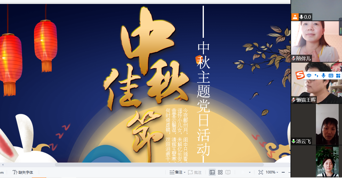 花好月圆人团圆,迎风赏月阖家欢。为迎接一年一度的中秋佳节,9月15日下午,思政部教工党支部组织开展主题党日活动,思政部全体党员通过腾讯会议在云端相聚,共庆团圆、共话中秋。
