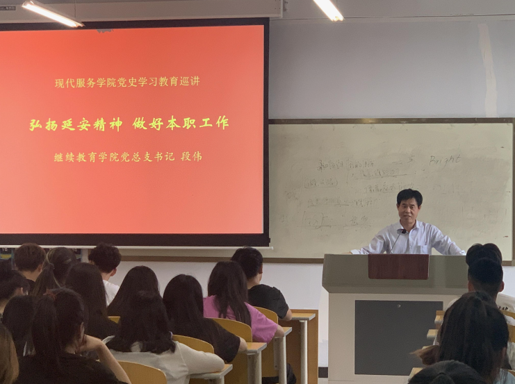 为切实加强基层党建,扎实开展党史学习教育,引导广大师生在党史学习教育中感悟伟大精神,传承红色基因,凝聚奋进力量,6月1日,现代服务学院在1A505教室开展了党史学习教育之书记讲党课活动。会议由现代服务学院党总支书记郭防主持。继续教育学院党总支书记段伟以“弘扬延安精神,做好本职工作”为题讲授专题党课,现代服务学院部分学生参加学习。