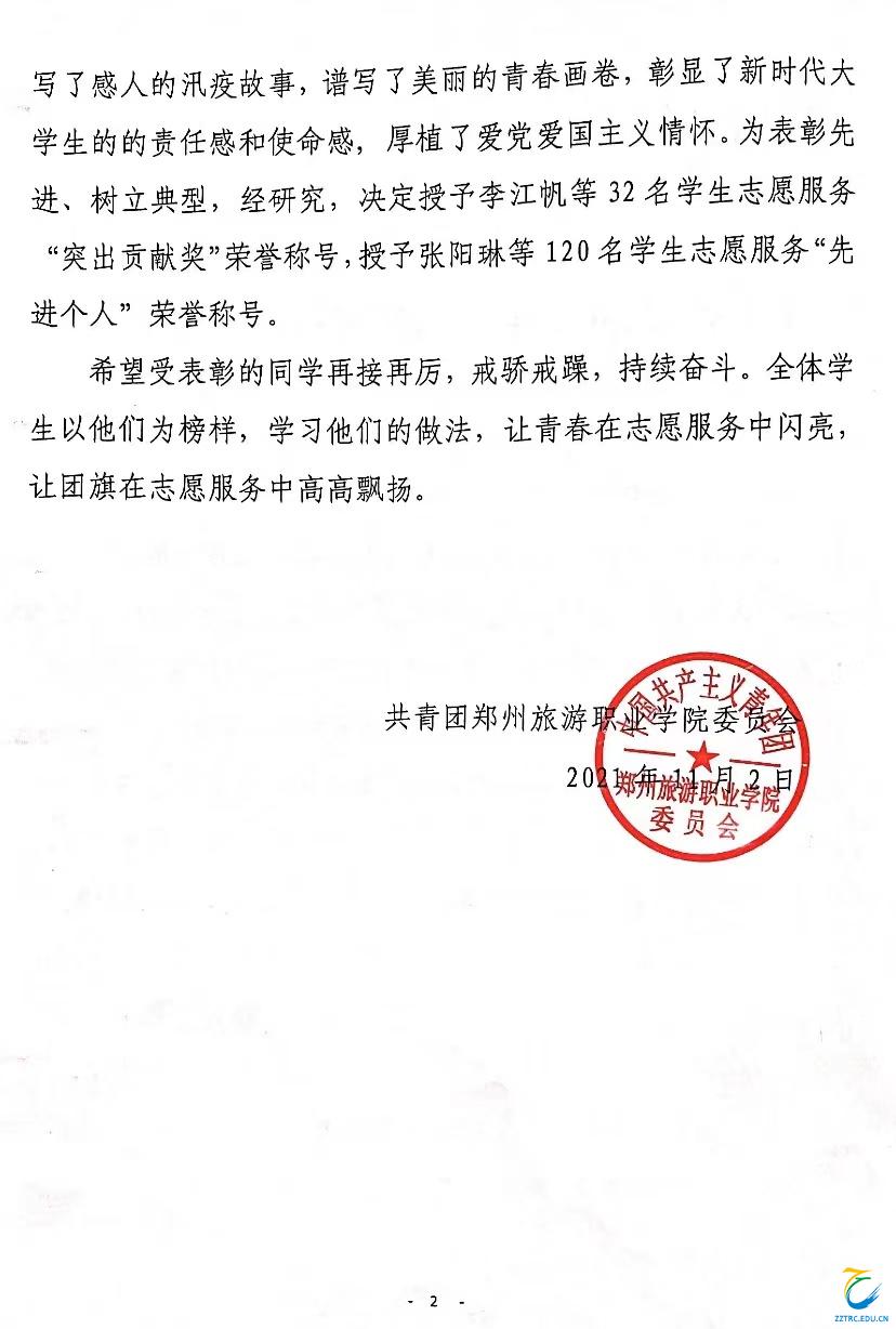 这是一次大考,是一次党史学习教育的生动实践,一堂眼前深刻的思政大课,一本鲜活生动的德育教材。在此过程中,志愿者们发扬一方有难,八方支援的奉献精神,发出“青春有我,尽锐冲锋”的豪迈誓言,以实际行动投身于“双线”战场中。他们迎难而上,共克时艰,众志成城,奋战一线,在“双线”战场书写了感人的汛疫故事,谱写了美丽的青春画卷,彰显了新时代大学生的的责任感和使命感, 厚植了爱党爱国主义情怀。为表彰先进、树立典型,经研究,决定授予李江帆等32名学生志愿服务“突出贡献奖”荣誉称号,授予张阳琳等120名学生志愿服务“先进个人”荣誉称号。