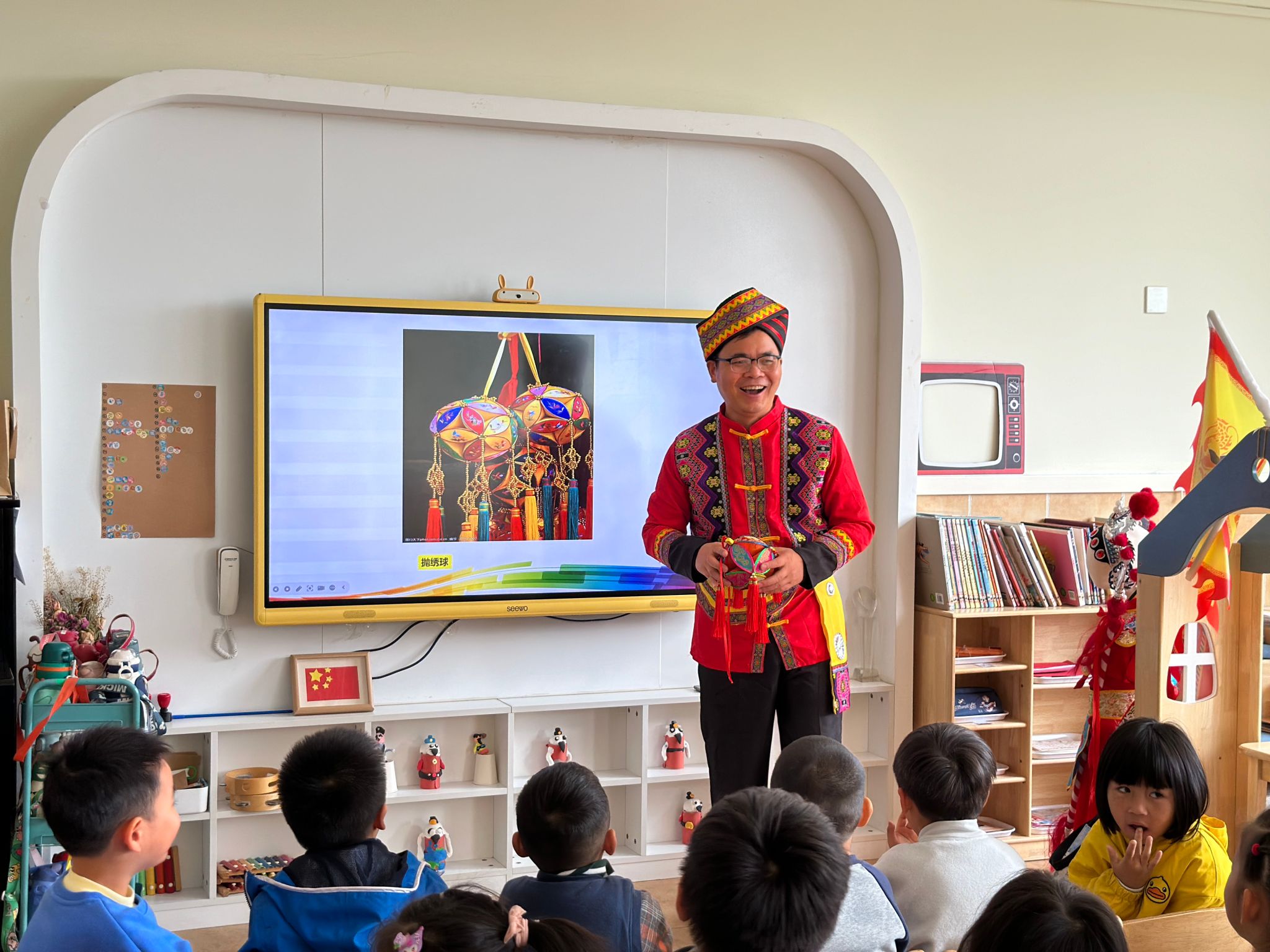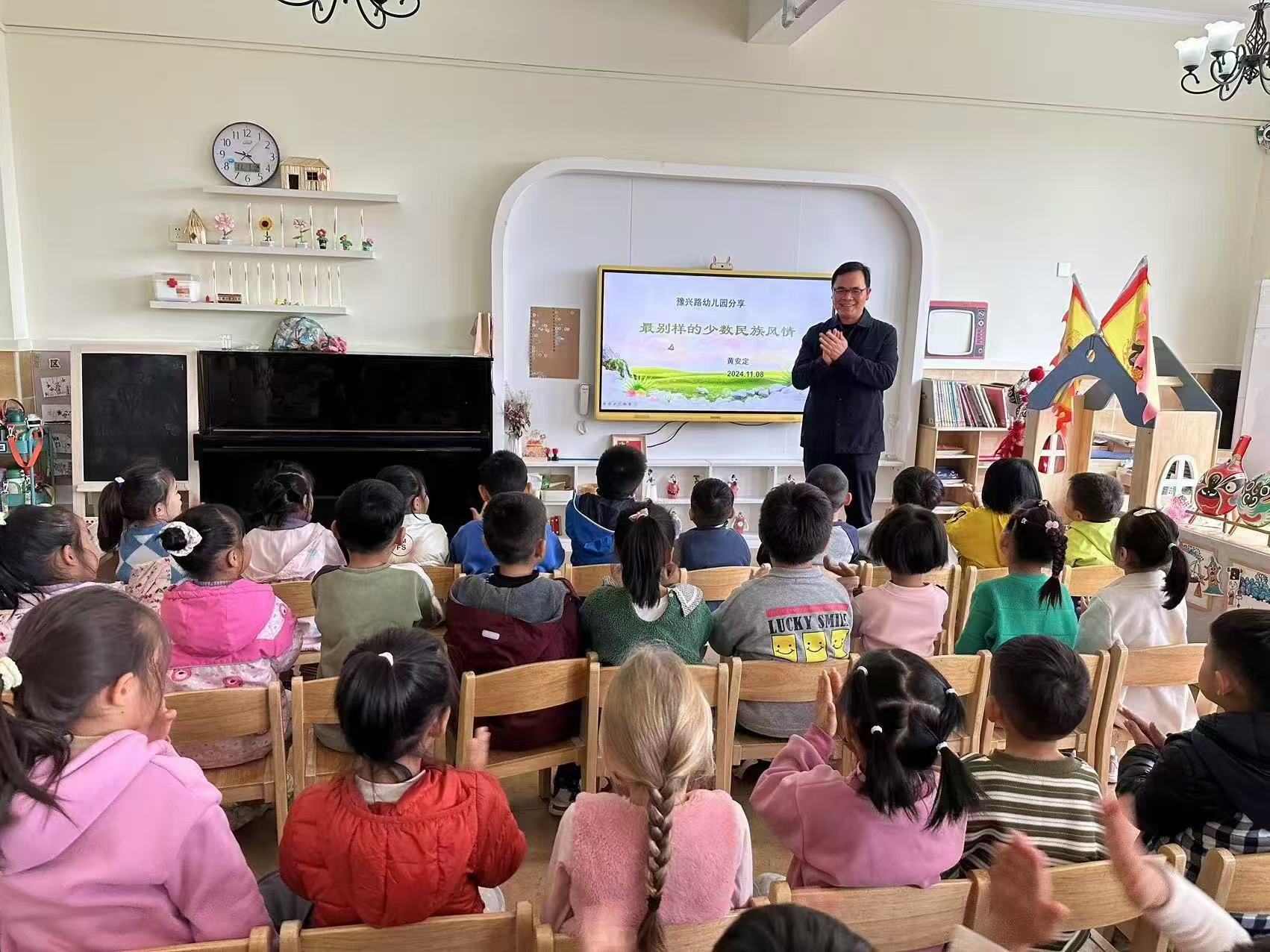 11月8日上午,人文学院《中华优秀传统文化》课程主讲教师黄安定带着“绚丽多姿的民族民俗”特色课程主题走进豫兴路幼儿园,课程展示得到了参与听课所有师生的高度认可,彰显高校服务社会的责任与担当。别开生面的课堂从“寻找最可爱的小朋友”开始,以讲故事为主要形式,以“别样的民族风情”为载体,向小朋友们展示了祖国“大公鸡”版图上不同民族唯美的生活环境、多姿多彩的民族服饰、独特的民俗节庆文化、舌尖上丰富多彩的特色美食等,通过妙趣横生的课堂语言和鲜活的课堂互动,不仅向小朋友们呈现了祖国壮美的大好河山,同时通俗易懂地向小朋友们传送中华优秀民族文化的精髓。难能可贵的是小朋友们在课堂的探索和交流中找到了“中华民族越来越强大”的原因,那是因为不同民族虽然语言、服饰、饮食等方面有所差别,但我们国家56个民族团结一心、共同努力,我们的生活将变得更加美好。