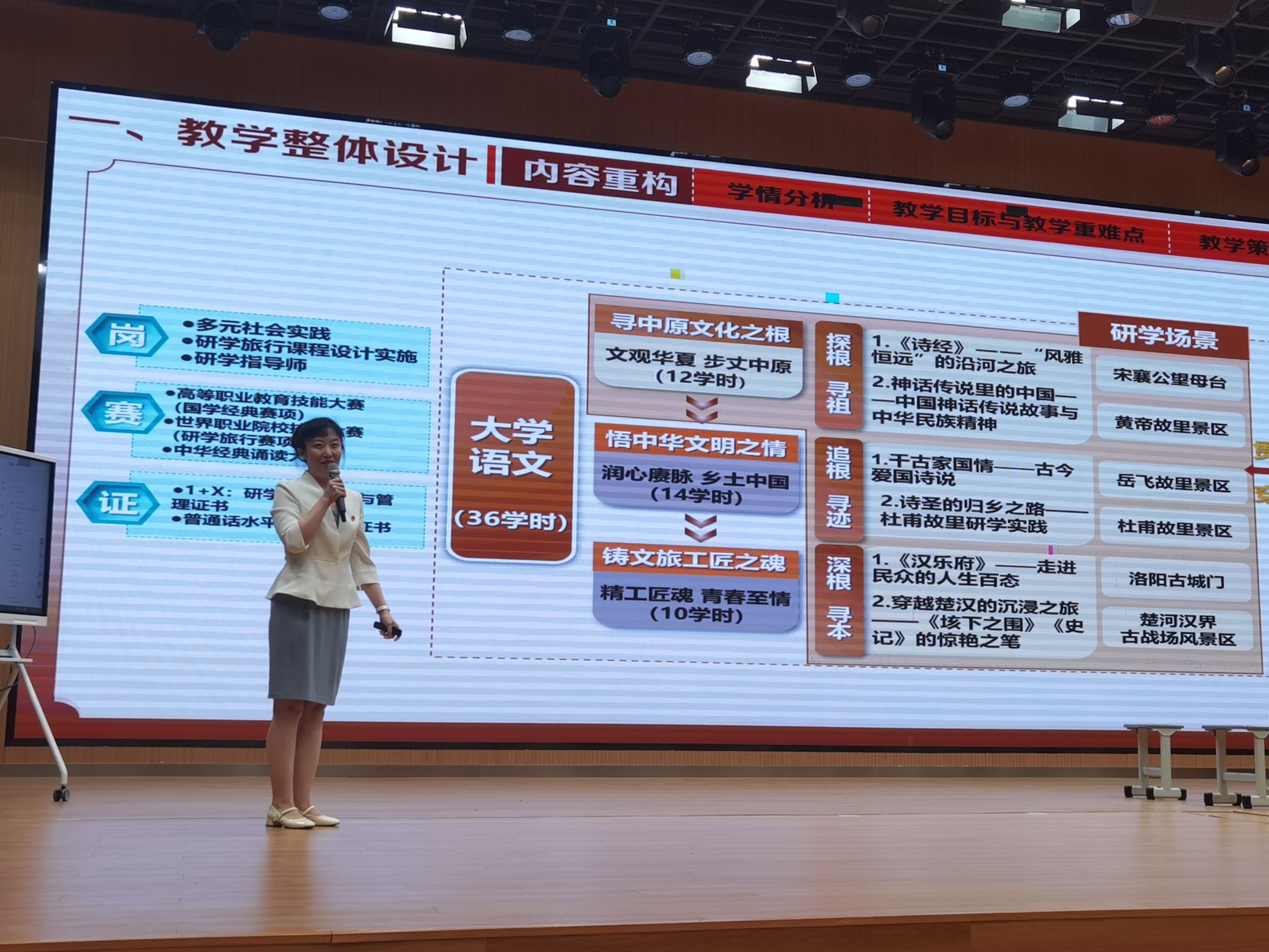 为推进创新教学模式,适应教育数字化新形势,11月27日学校举办了“数字赋能 共筑未来”示范课展示活动,旅游管理学院和人文学院两支教学团队分别进行了展示。校党委书记王艳红、副校长张建军出席,全体教师参加。我院教师孙亦静和弓婧媛带来的示范课《文观华夏 步丈中原》,为全校师生呈现了一场别开生面、人文底蕴与数字技术深度融合的教学盛宴。
