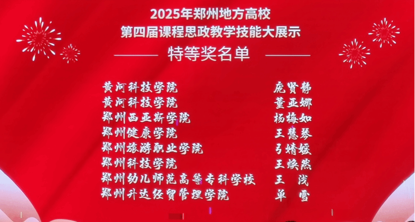 本届赛事由中共郑州市委宣传部、郑州市教育局联合主办,郑州地方高校思政课教学指导委员会、郑州健康学院共同承办。来自全市地方高校132名优秀教师同台竞技,切磋教学技艺。在竞争激烈的课程思政教学技能大展示环节,弓婧媛老师凭借扎实的教学功底和创新的思政融入能力,从49名参赛选手中脱颖而出,最终摘得特等奖桂冠。
