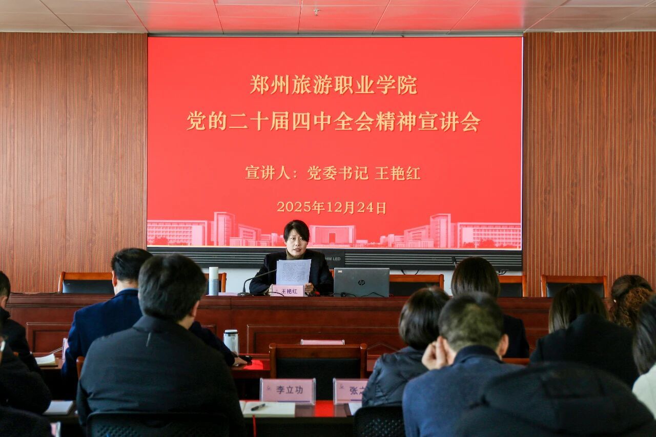 随后,王艳红以《学深悟透党的二十届四中全会精神 推进新时代文旅职业教育高质量发展》为题,围绕全会精神的重大意义、核心要义以及如何结合学校实际推动落实等方面,为与会人员讲授专题党课。她强调,全校党员干部要将党的二十届四中全会精神与习近平新时代中国特色社会主义思想、习近平总书记河南考察重要讲话精神贯通领悟,立足学校办学定位,在文旅融合、职业教育创新、文旅标准化建设、微短剧与文创产业发展等关键领域主动破局,着力打造国家级、省级有影响力的标志性成果,全面提升学校核心竞争力与服务地方发展质效。