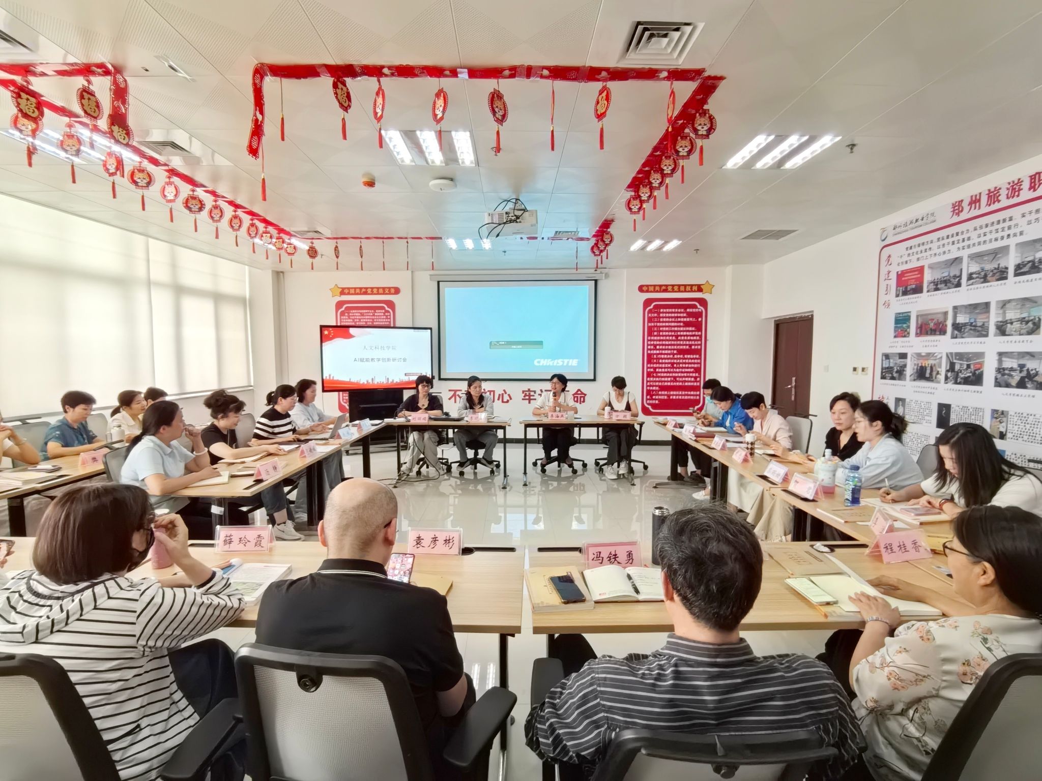 为迎接学院战略转型,先后举办两场“AI赋能教学创新研讨会”。侯春慧、房媛等教师分享数字技术与教学融合实践经验,推动“科技赋能人文、融合驱动创新”理念落地。