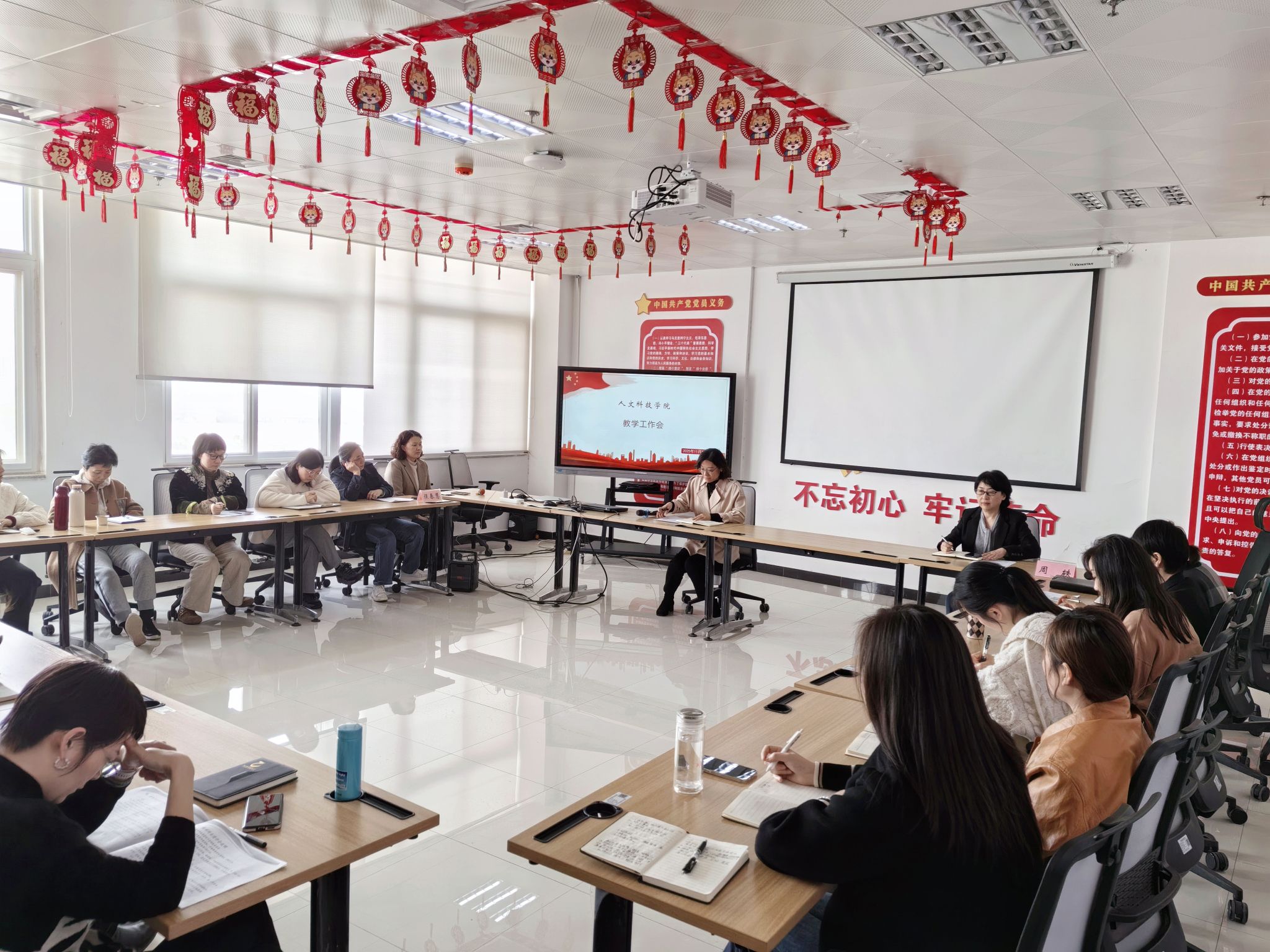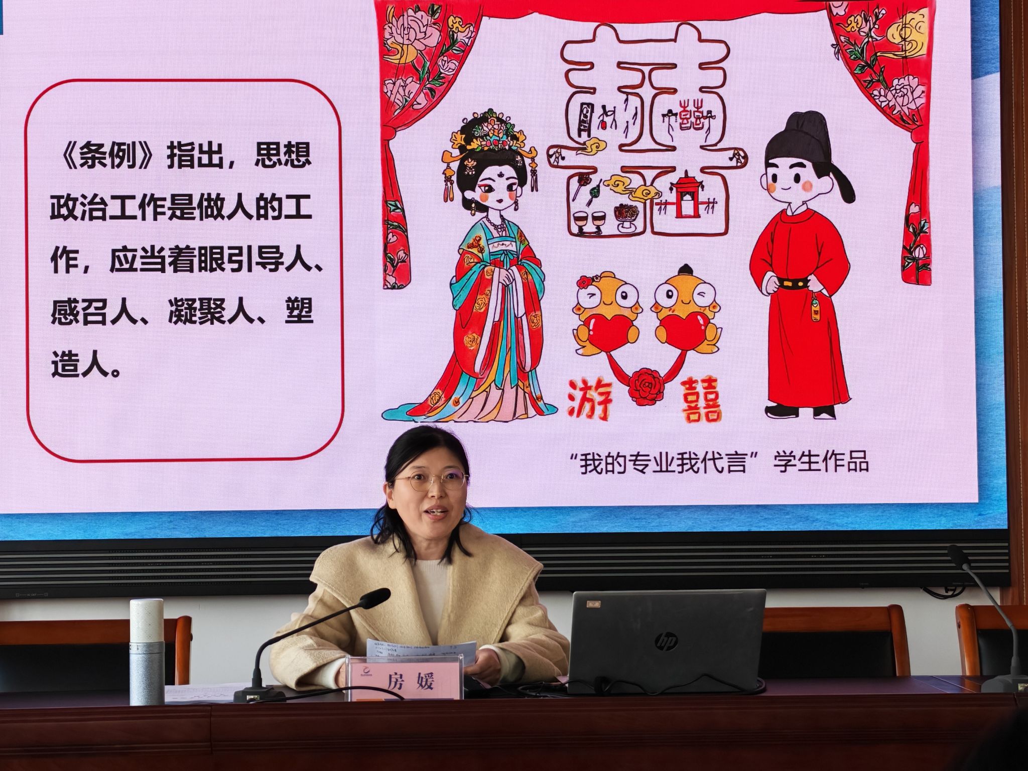 房媛老师作为教师代表,在党委理论学习中心组(扩大)学习会联合教研环节,分享课程思政建设经验,推动思想政治工作与教育教学深度融合。