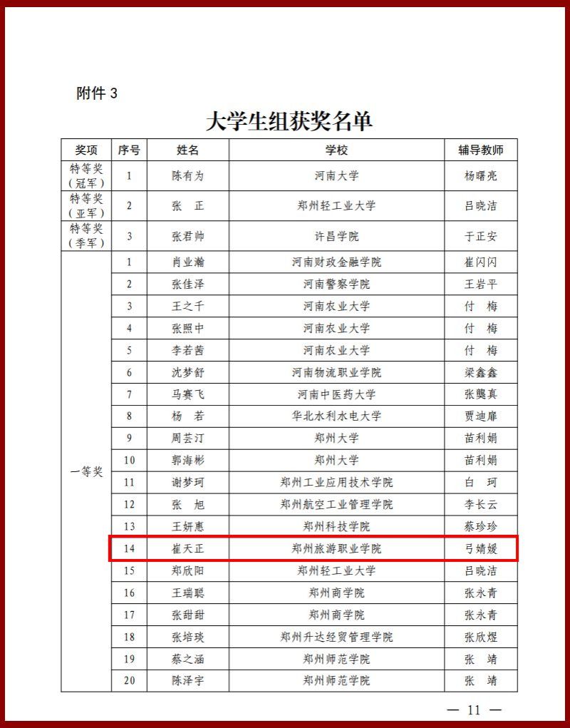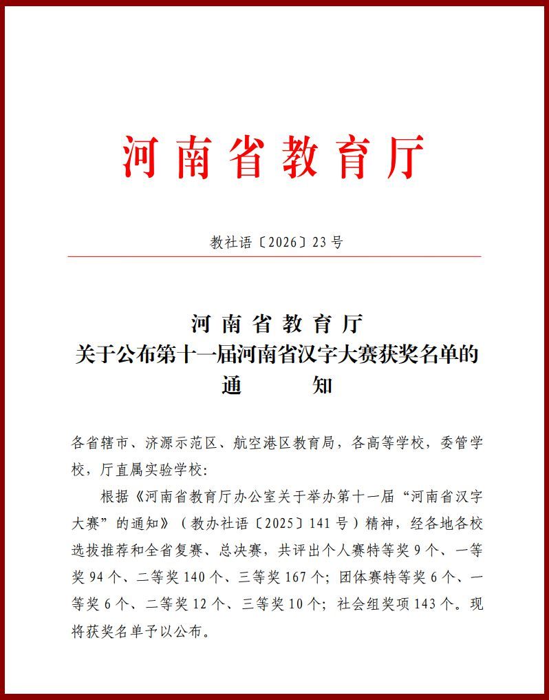 近日,河南省教育厅印发《关于公布第十一届河南省汉字大赛获奖名单的通知》,由pp电子人文科技学院教师弓婧媛指导的学生崔天正、苏铭哲、张学涵在大赛中表现优异,分别荣获大学生组一等奖和三等奖。