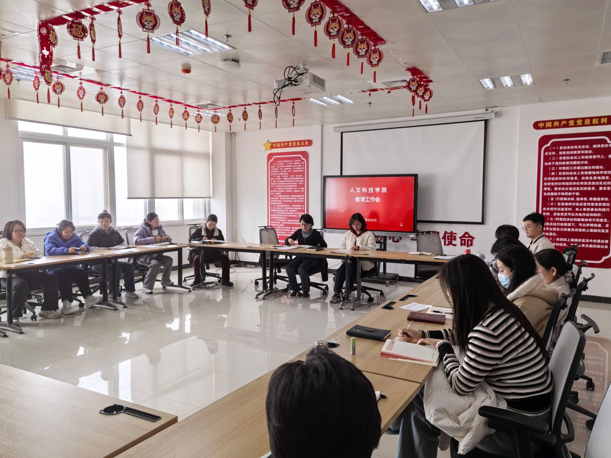 会上,党总支组织委员、文科教研室主任侯春慧通报了假期关于《2023-2025优秀征文作品集》汇编整理工作及“2026年经典诵读大赛”准备情况,理科教研室主任李晓燕详细分析了《人文科技学院课程优化需求调研》的统计结果,老师们假期的辛苦付出,为学院深化教学改革、优化课程体系提供了有力支撑。随后,党总支宣传委员房媛就分管领域进行分析研判。