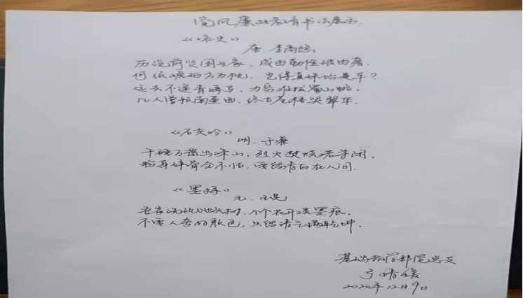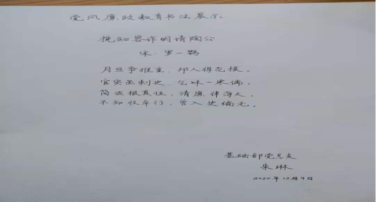 为了深入贯彻落实党的十九届五中全会精神,弘扬廉洁理念,凝聚清风正气,推进校园廉政文化建设,2020年12月9日下午,基础部党总支组织全体党员开展廉政文化书法作品展示活动。
