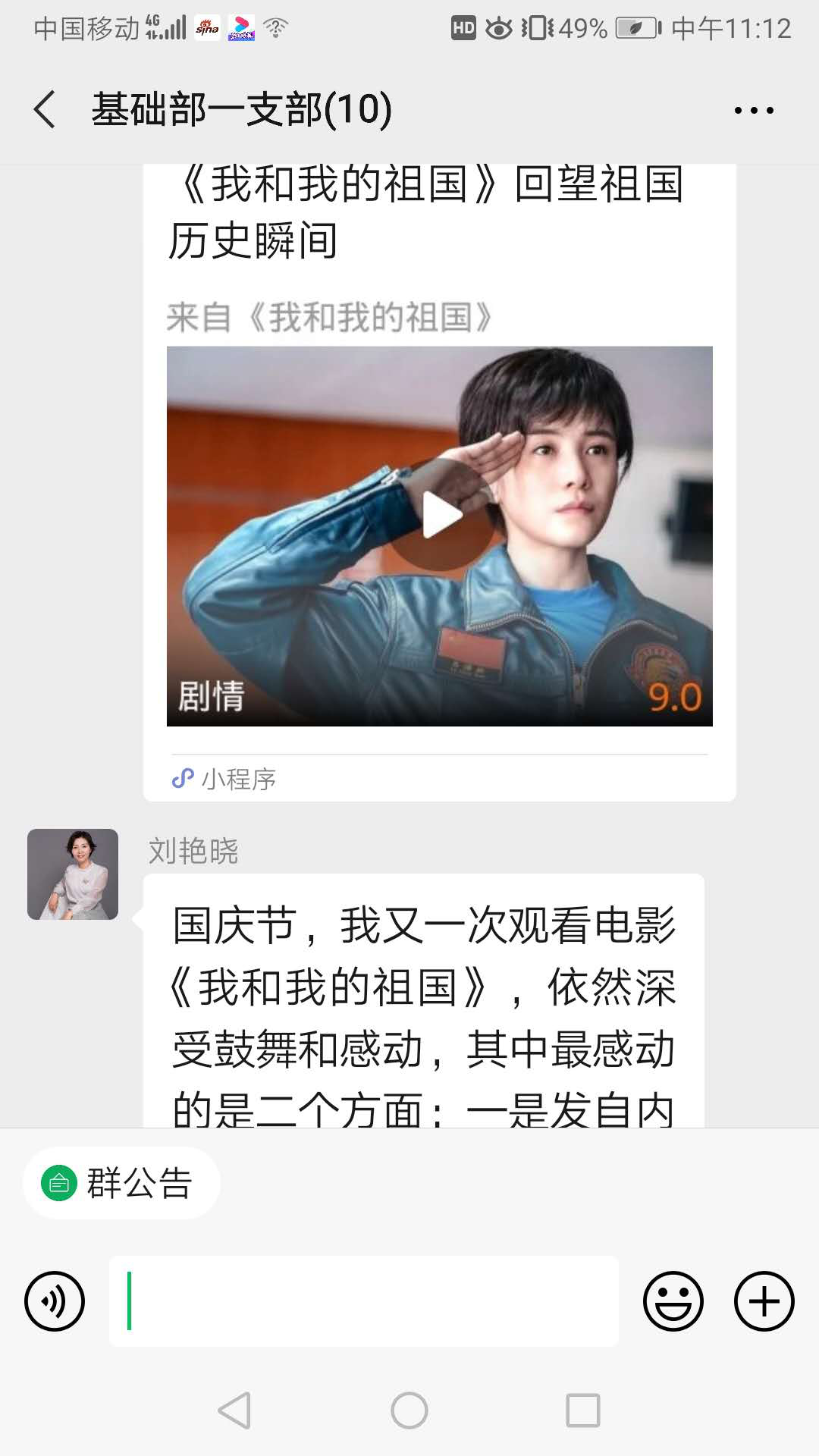 国庆期间,为了大力弘扬民族精神,进一步加强爱国主义教育,增强大家对祖国的深厚情感和使命感、责任感,为实现中华民族伟大复兴的中国梦而努力奋斗。基础教学部为了响应院党委的号召,在王小红书记的组织下,全体党员又一次观看了《我和我的祖国》这部爱国主义影片。