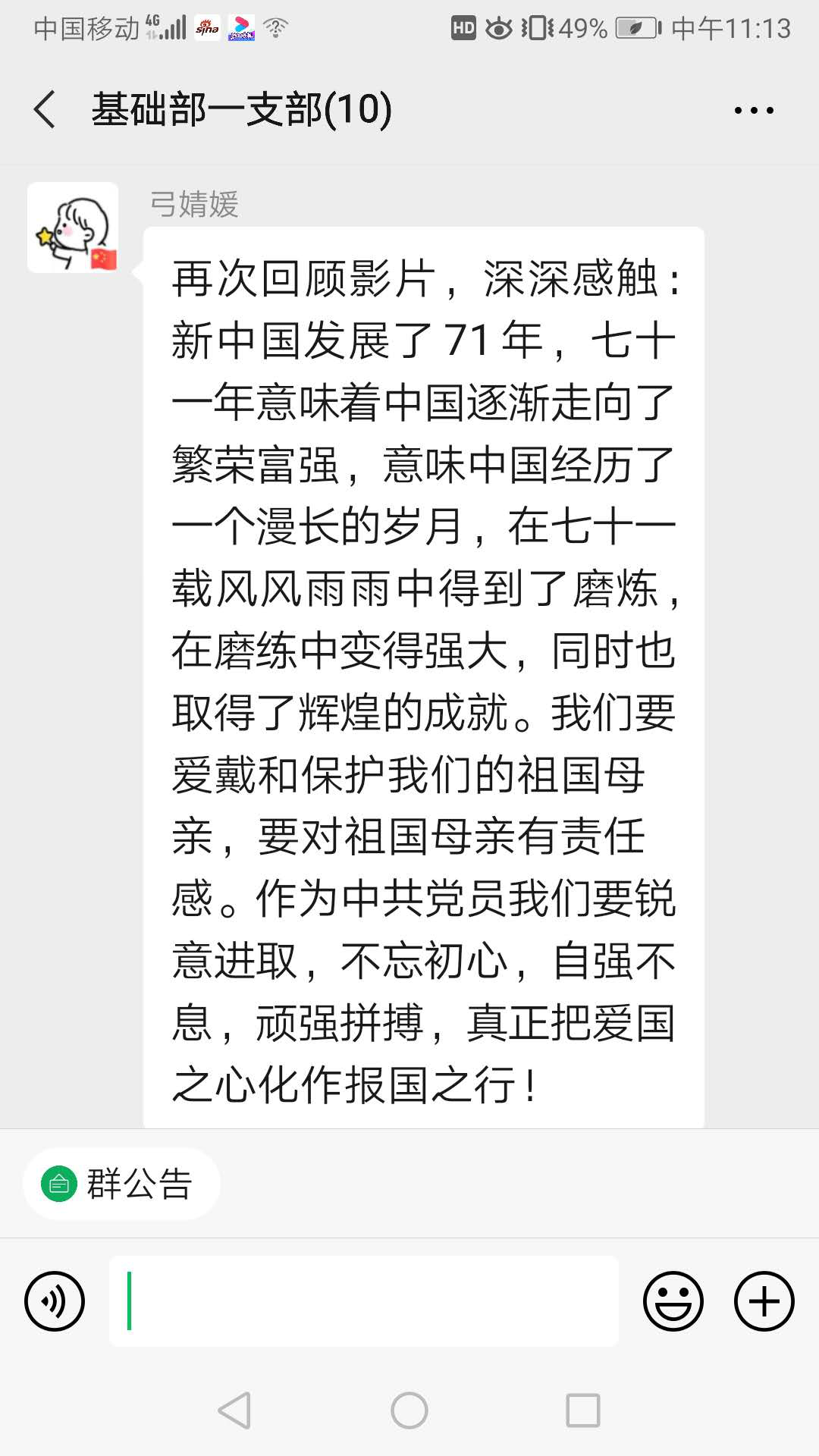 这部影片讲述的是不同时期、不同领域的人物为了祖国的繁荣发展默默的奉献和付出,通过观看影片,大家深受启发,纷纷结合现实生活找差距、谈体会,进一步坚定了党员的神圣使命和价值。我们要不忘初心、锐意进取、顽强拼搏,踏踏实实做好本职工作,把爱国之情和具体的工作结合在一起,把个人理想和伟大的中国梦结合在一起。