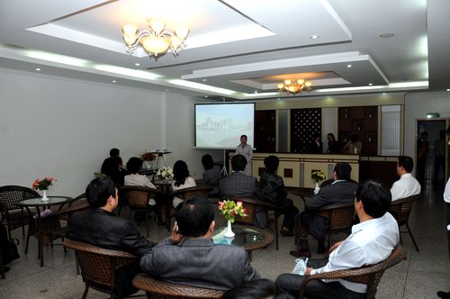 张司长一行首先在学院接待室听取了我院迎接“一类城市语言文字”评估筹备工作汇报。院长樊豫陇从语言文字工作的重要性、机构、氛围以及成就四个部分就学院迎评筹备工作进行了全面汇报。