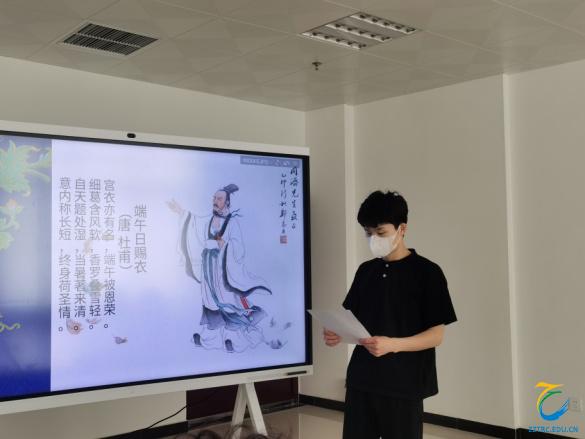 本次活动在行政楼701举行,活动主题是“品味诗意端午培育家国情怀”。首先,工会副主席李长秋介绍了端午节的由来,着重讲述了伟大爱国诗人屈原的故事,唐朝文秀在《端午》一诗中写到“节分端午自谁言,万古传闻为屈原。”大家为屈原的爱国情怀深深感染。随后,同学们共同追忆小时候怎样过端午,端午节的习俗及趣事,在欢乐声中大家感受到我们国家的飞速发展,生活水平的日益提高。最后,师生共同分享了与端午有关的诗词,文天祥在《端午》一诗中写道:“唯有烈士心,不随水俱逝。”表达了他坚贞不屈的民族气节。清代诗人朱彝尊写诗纪念春秋时期吴国大夫伍子胥:“胜日衔杯罢,轻舟解缆初。尽传迎伍君,不比吊三闾。”
