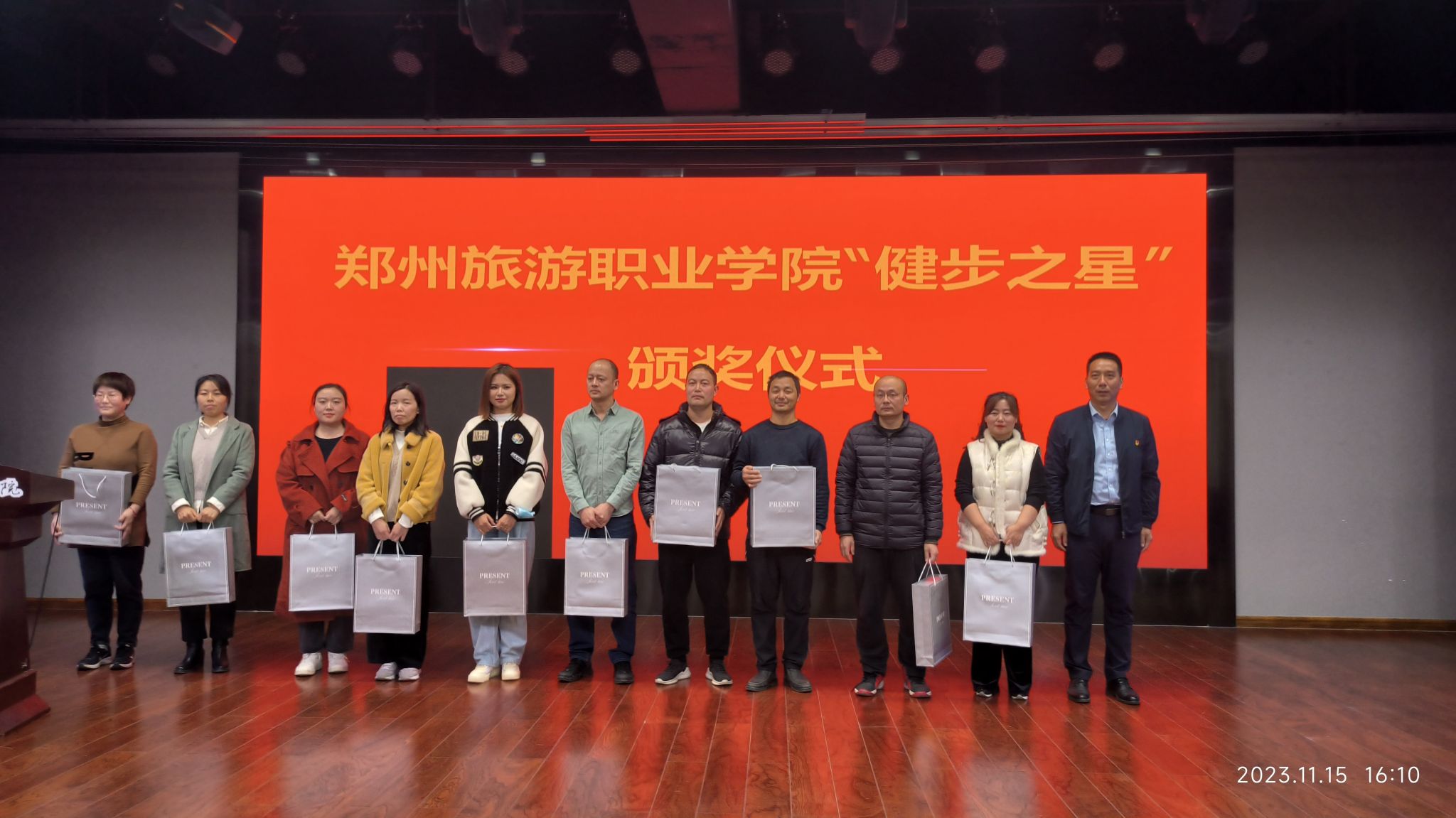 闫部长代表校工会向获奖教职工表示热烈祝贺并讲话,充分肯定了健步走活动的重要意义,希望大家能继续保持积极向上的工作心态,养成健康自律的生活习惯,以昂扬向上的精神面貌投入到工作生活中。颁奖仪式现场,情绪高涨、气氛热烈,获奖教师纷纷表示在今后的工作和生活中会坚持运动锻炼,贯彻健康生活、快乐工作的理念。仪式最后,大家合影留念。