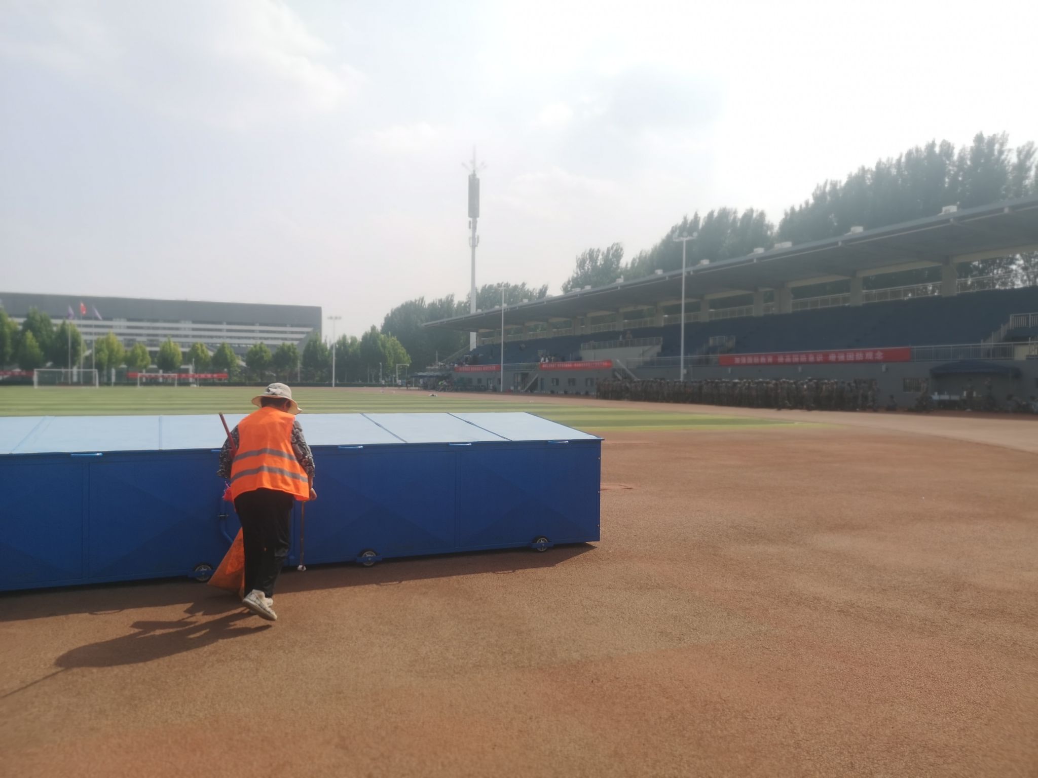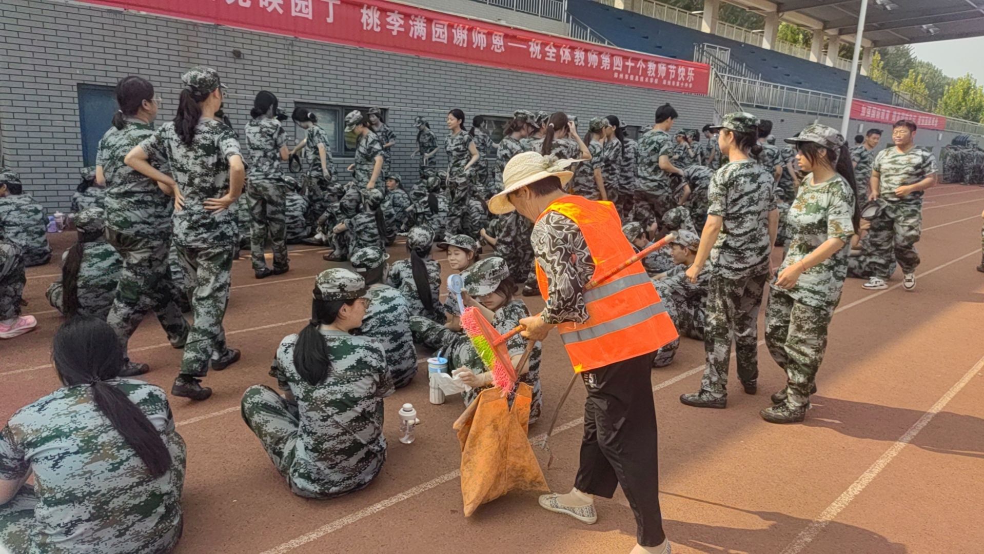 校园管理科做好军训场所的清洁工作,给军训学生提供一个干净、整洁、卫生的环境。