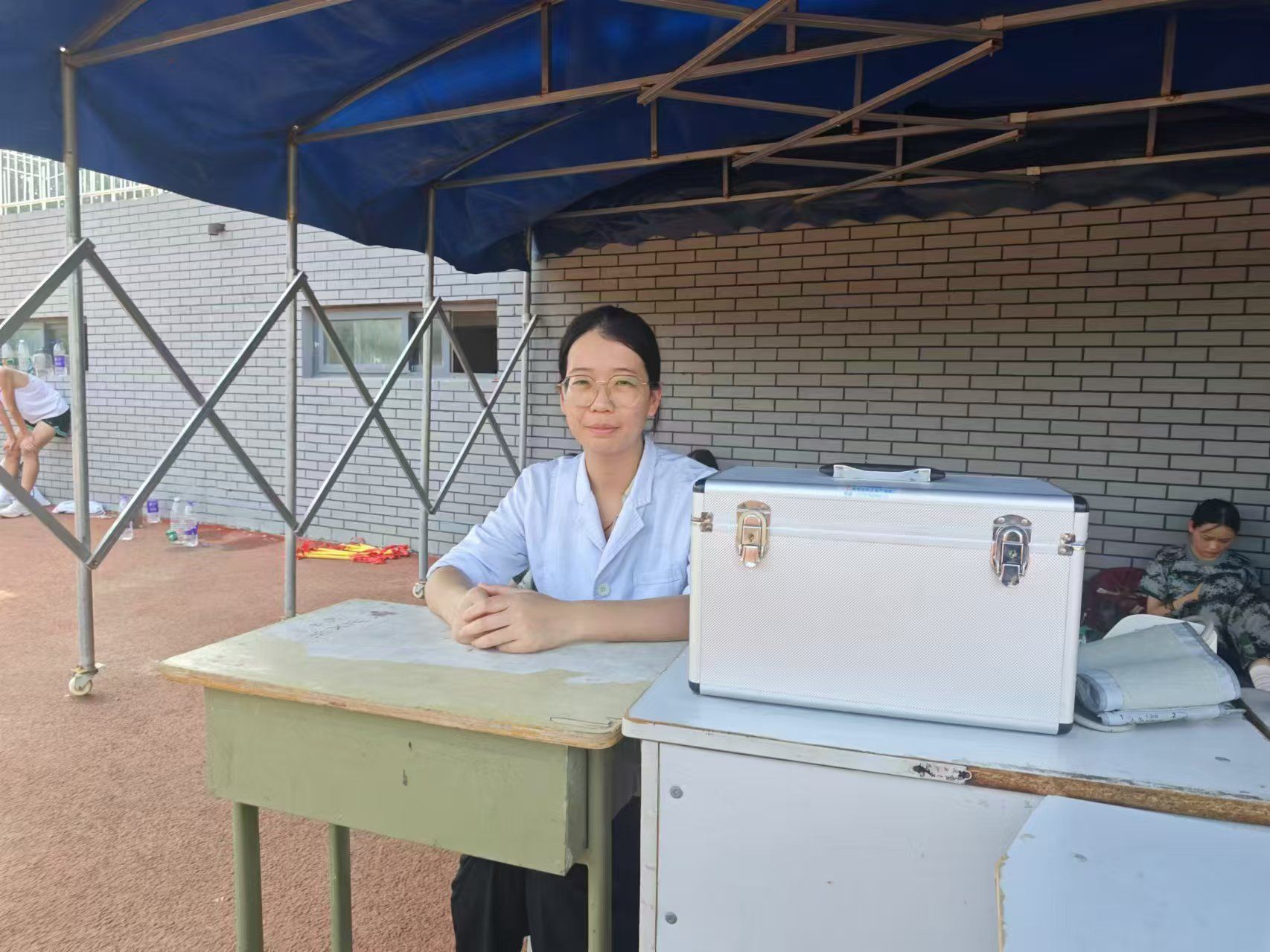 为确保第一时间对突发情况进行应急处理,校医务室全员出动,轮班值守在学校操场与医务室,全力以赴为军训提供科学专业的,医疗卫生保障服务。