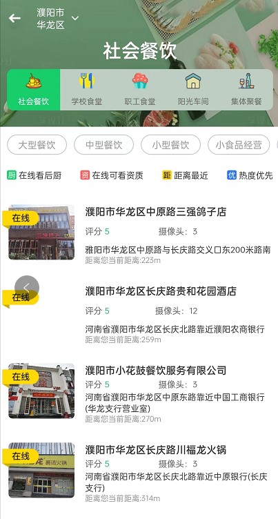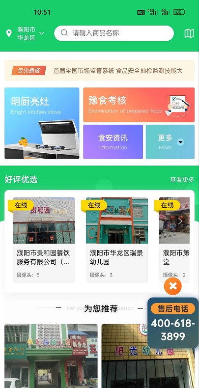 2、 点击明厨亮灶,即可显示已上线舌尖安全网的餐饮单位。也可以在主页上方搜索栏进行搜索。