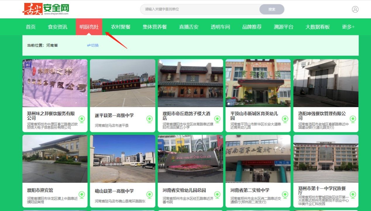 2、点击上方明厨亮灶栏,可看到全省所有已上线餐饮单位,点击单位名称,即可观看餐饮单位实时视频。
