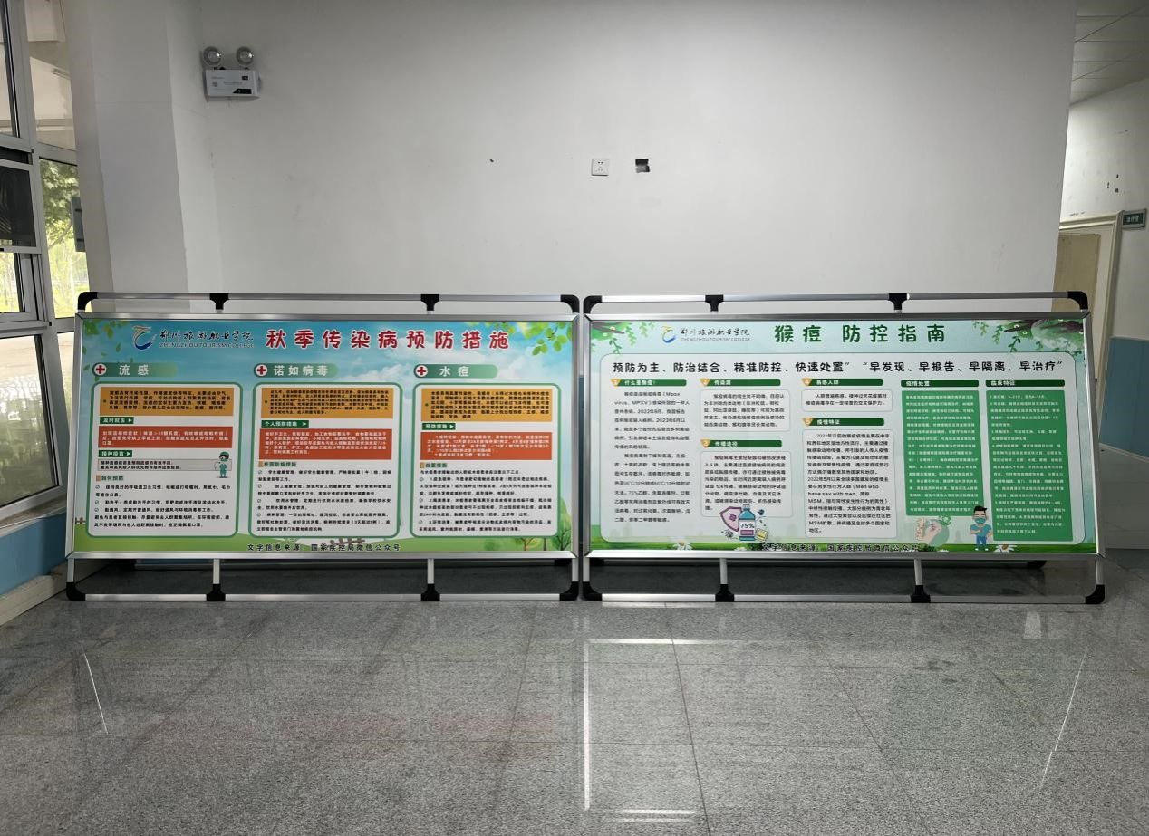 校医室针对秋季多发的流感、诺如病毒、水痘等传染病以及当前新发的猴痘制作传染病防治健康知识宣传展板,放置在校医室大厅,向广大师生宣传疾病防治知识,进一步提高师生自我健康意识,增强防病能力。