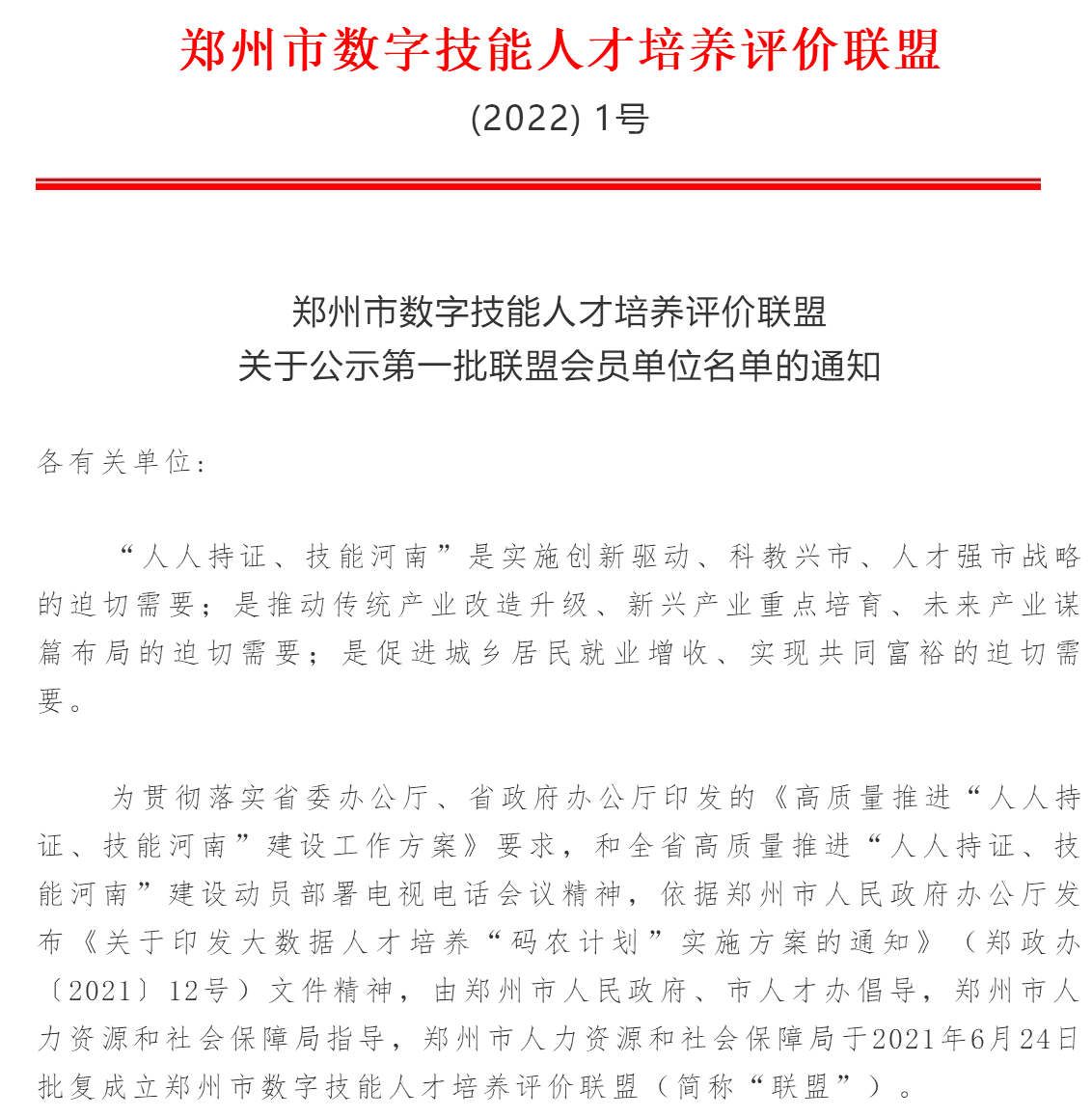 郑州市数字技能人才培养评价联盟(简称“联盟”)是积极响应郑州市人民政府办公厅发布《关于印发大数据人才培养“码农计划”实施方案的通知》(郑政办〔2021〕12号)文件精神,由郑州市人民政府、市人才办倡导,郑州市人力资源和社会保障局指导,于2021年6月24日由郑州市人力资源和社会保障局批复并作为指导单位成立的社会公益性组织。