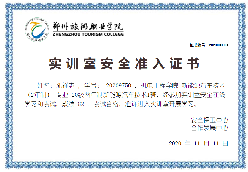 本次安全考核由合作发展中心负责,各二级学院配合,采取先学习再考试,面向2020级全体新生(不含五年制)开展,考核形式为线上考试,考试内容包括安全通识、设备操作、用火用气用电、化学品保管使用等方面,共有6214名学生通过考核并获得个人《安全准入证书》。
