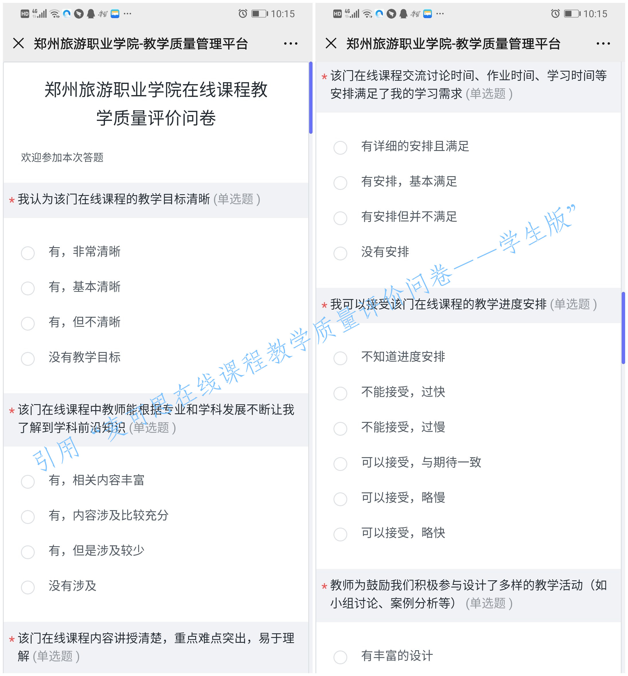 目前,pp电子“麦可思”教学质量管理平台(在线课程评价版)布署完成,经过前期调试,基础数据导入,目前进入平台使用阶段。线上教学质量监控工作分三个阶段进行,分别是在线课程基础调研阶段,在线课程教学进程评价阶段,在线课程教学质量评价阶段。3月3日,教务处通过麦可思系统下发了“在线课程教学开展情况调研问卷”,及时掌握我院线上教学开展情况,保证线上线下实质等效。