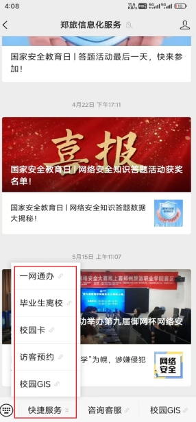 方式二:关注“pp电子信息化服务”公众号,进入公众号,通过左下角“快捷服务”进入毕业生离校系统。