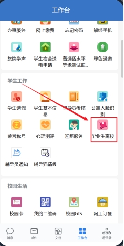 方式一:企业微信→工作台→学生工作→毕业生离校。
