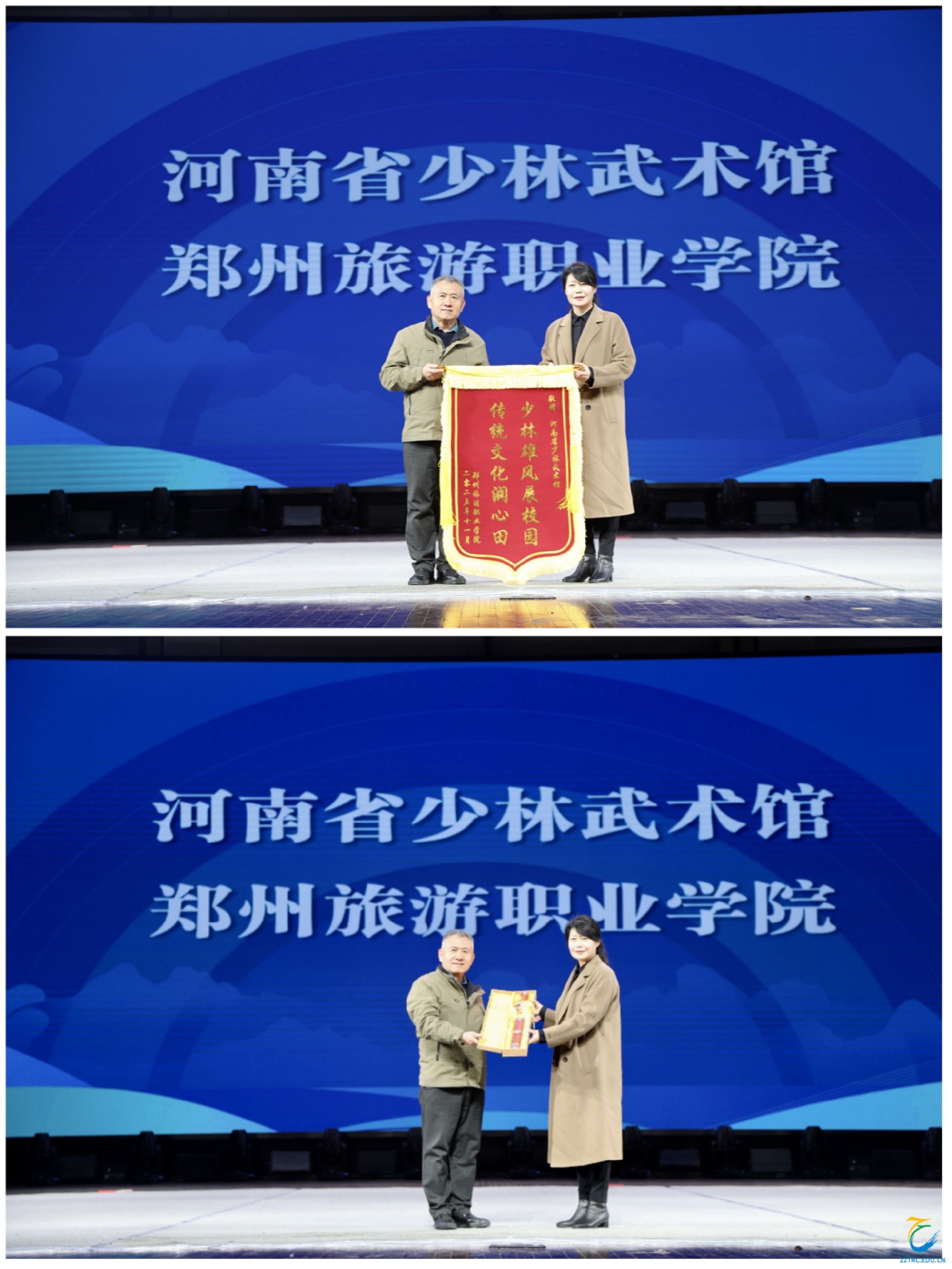 展演尾声,王艳红代表学校向陈俊杰馆长赠送锦旗,陈俊杰馆长回赠嵩山宝剑,双方以信物传递合作情谊,期待在传统文化传承与文旅人才培养的道路上“并肩前行”。