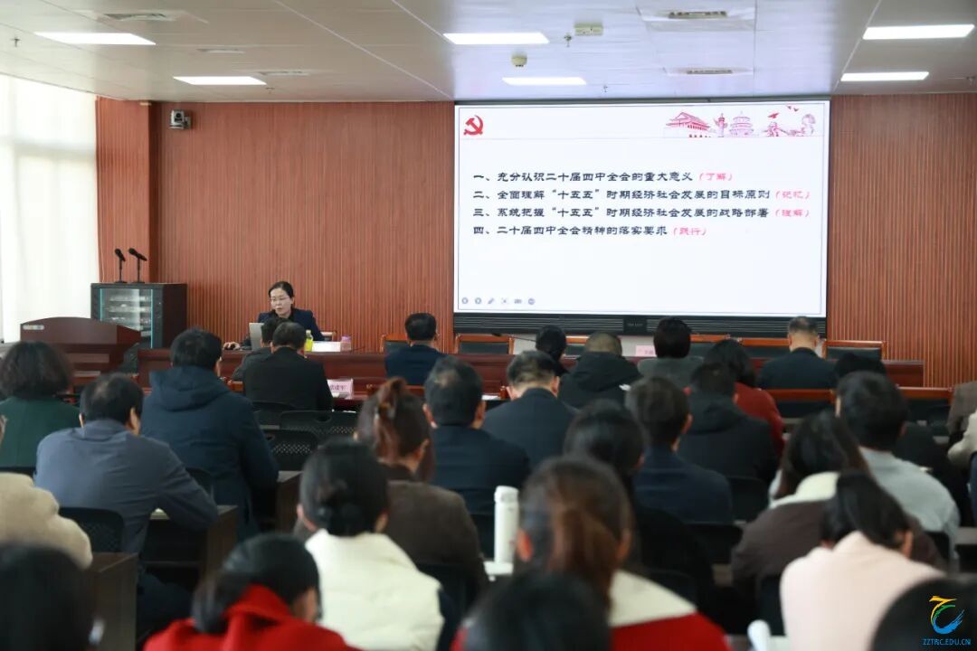 会议第一阶段,王艳红、肖世才、詹晓娅等校领导分别领学《中共中央关于制定国民经济和社会发展第十五个五年规划的建议》《中国共产党第二十届中央委员会第四次全体会议公报》以及《关于<中共中央关于制定国民经济和社会发展第十五个五年规划的建议>的说明》等重要文献,为深入学习奠定理论根基。会议特邀郑州市委党校中华文化教研部主任李敬作题为“党的二十届四中全会精神解读”的专题辅导报告。李敬从历史、理论、实践与世界四个维度,系统阐释全会的重大意义与“十五五”时期经济社会发展的目标原则、战略部署,为参会人员提供了兼具理论高度与实践深度的专业指导。