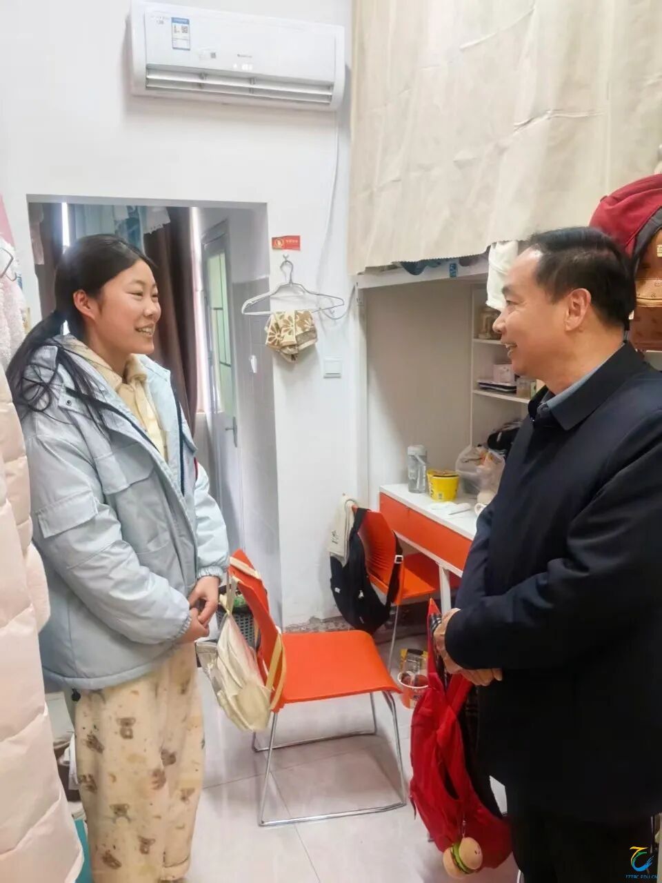 肖世才首先来到学生宿舍区,走进1号公寓楼与留校学生进行亲切交谈。他详细询问同学们在校期间的学习、生活情况,并代表学校送上节日问候,叮嘱大家要注意防寒保暖、劳逸结合,度过一个安全、充实的假期。他表示,学校始终关注同学们的在校状态与实际需求,并要求各学院及相关职能部门进一步增强服务意识,及时回应解决同学们反映的问题,切实让每一位留校学生安心过节,感受“家”一般的温暖。