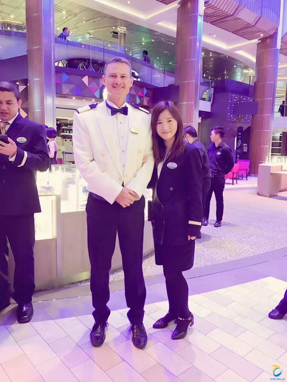 旅游外语系2013级学生李玉凤。在刚上船时,她的英语还带着河南正阳口音,可是凭借自身的努力和高情商,完美实现了一个船期从RSA(客房送餐员)到Mess Attendant(员工餐厅服务员)到Guest Service Officer(客户服务专员)的三级跳,这在游轮员工的升职历程上,也是屈指可数的一例。