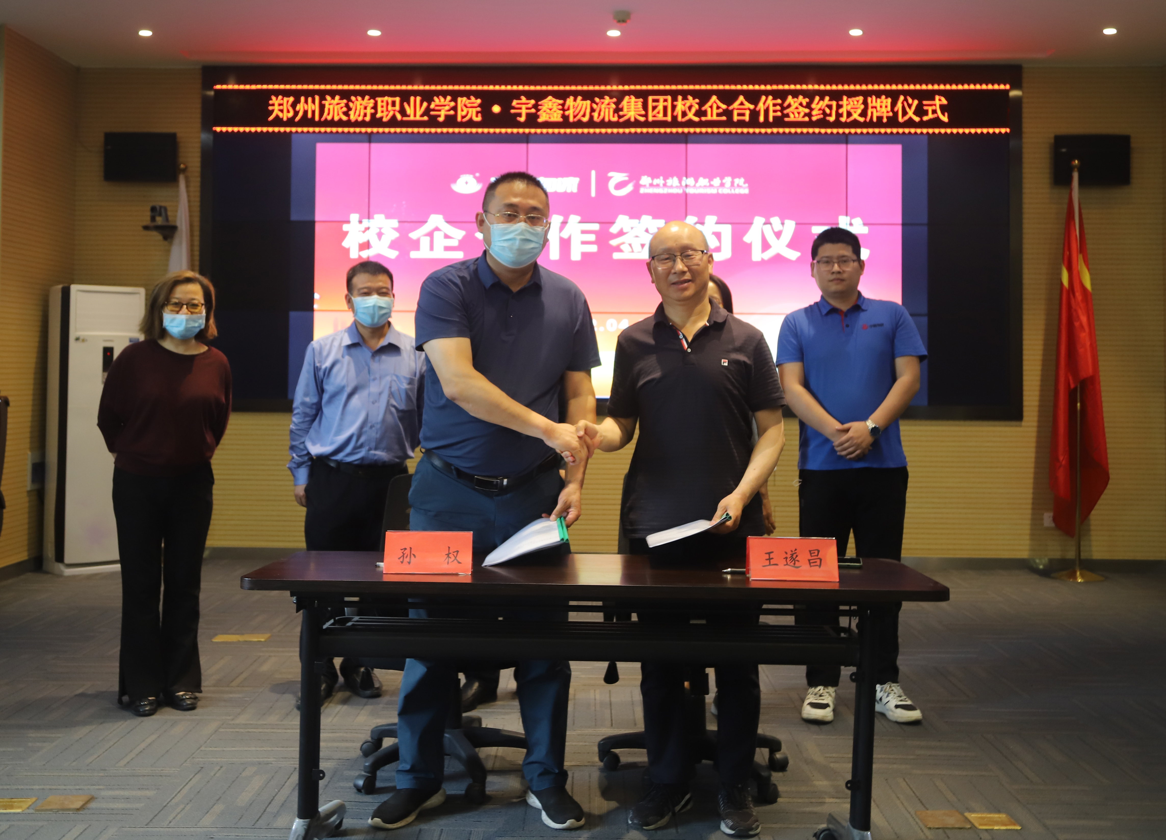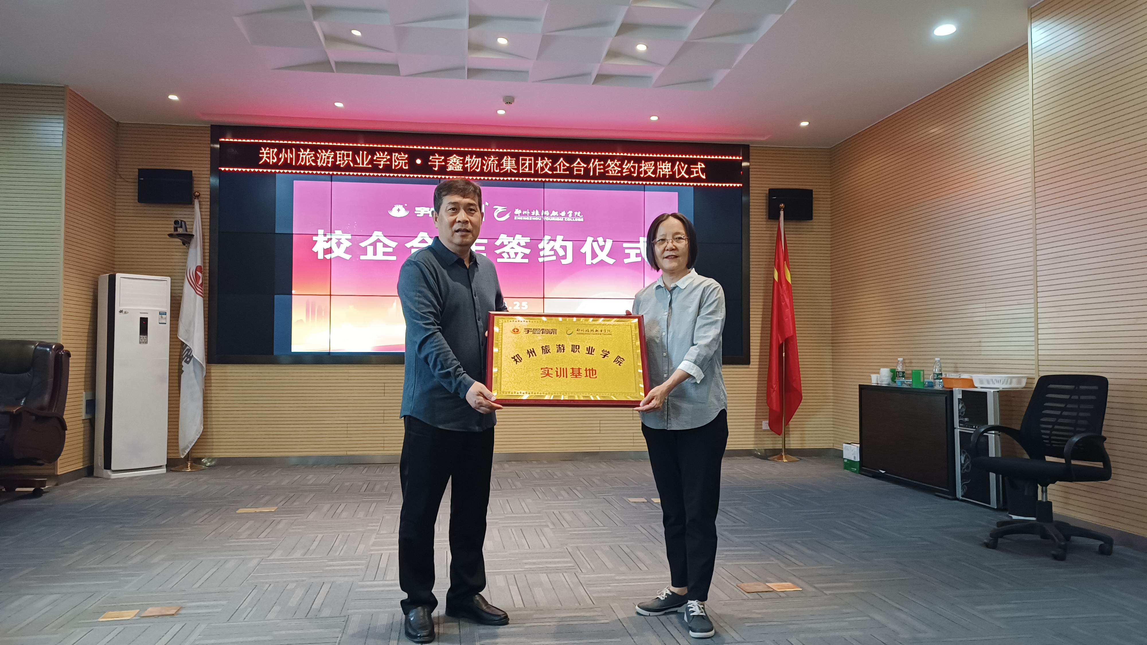 洽谈会后,国际工商学院院长孙权与宇鑫学院常务副院长王遂昌代表双方单位签署并互换合作协议;副校长徐永清代表学校授予宇鑫物流集团“pp电子游戏平台网站实训基地”牌匾,宇鑫物流集团党总支部书记兼副董事长王琳授予pp电子“河南宇鑫物流集团有限公司人才培养基地”牌匾。