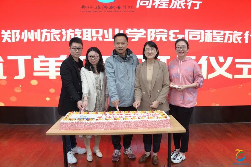 最后,校方代表李俊与同程旅行网代表纪乐经理共同举行授牌仪式。校企合作双方领导与嘉宾共同切蛋糕合照留影,庆祝开班仪式取得圆满成功。