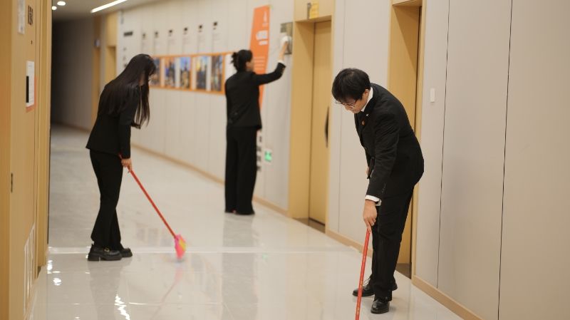 活动中,入团积极分子们分工明确、干劲十足。大家手持扫帚、抹布、拖把等工具,重点对实训楼走廊、教室、楼梯扶手等公共区域进行全面清理。面对角落的灰尘和顽固污渍,大家相互配合、细致清整,用实际行动展现了青年学子的责任与担当,为师生们打造了干净、舒适的学习实训空间。实训楼作为酒店管理专业核心实训场地,承载着理论与实践融合的重要功能。参与活动的入团积极分子表示,通过亲手美化校园环境,深刻的感受到志愿服务的意义,今后将会以更高标准要求自己,积极向团组织靠拢,用实际行动传递榜样力量。