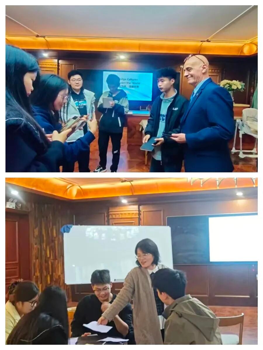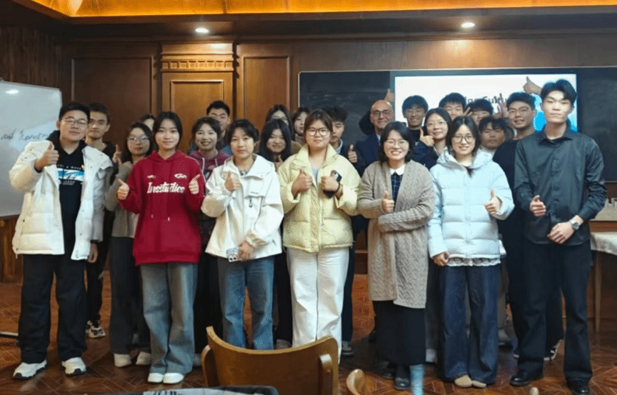 在自由交流中,同学们围绕文化、职业、影视与运动等话题踊跃提问。Ronald分享了他在中国多座城市旅行的经历,表达了对中国文化真挚的热爱,并特别称赞中国武术与中医的独特价值。他寄语同学们要珍视本土文化,以自信的姿态走向世界。