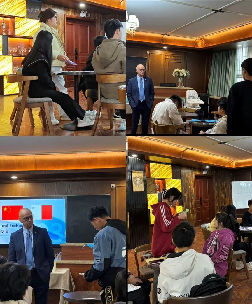 主题分享环节亮点纷呈。学生作为“文化使者”,用英语介绍了河南烩面、胡辣汤、信阳毛尖等特色饮食,春节习俗,以及河南博物院、鸡公山等家乡景点。Ronald则对应分享了马耳他融合多元文明的饮食文化、披萨发展历程,以及当地建筑与海滨旅游资源。他还结合自身从酒店厨师到旅游学院教师的职业发展,鼓励学生始终追求自己所热爱的事业。