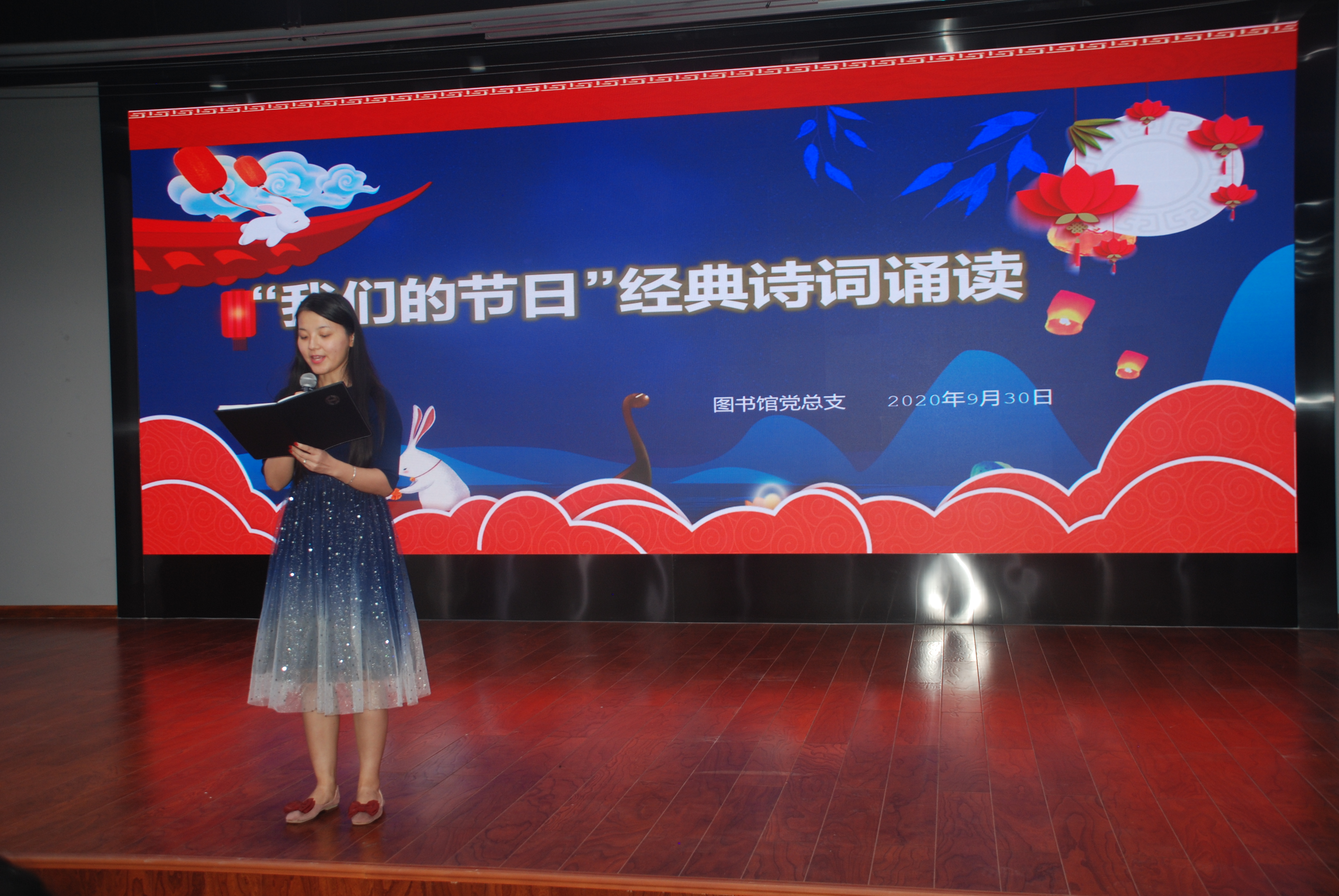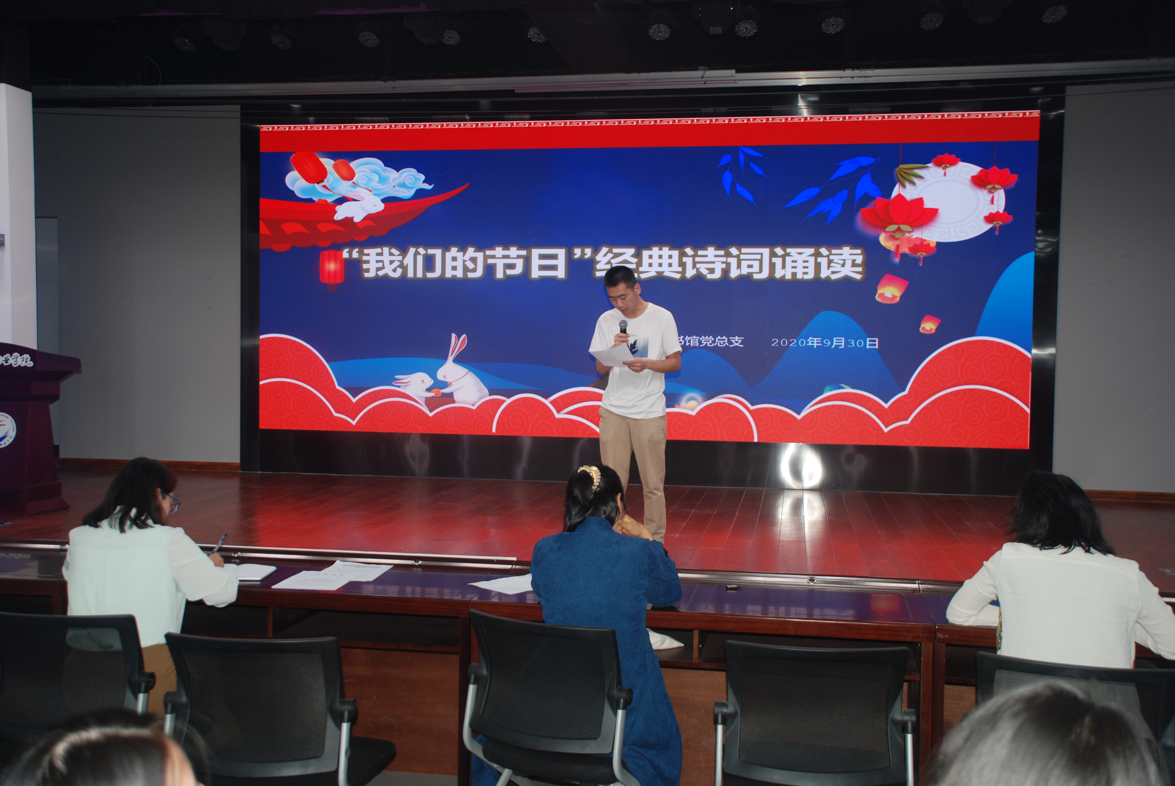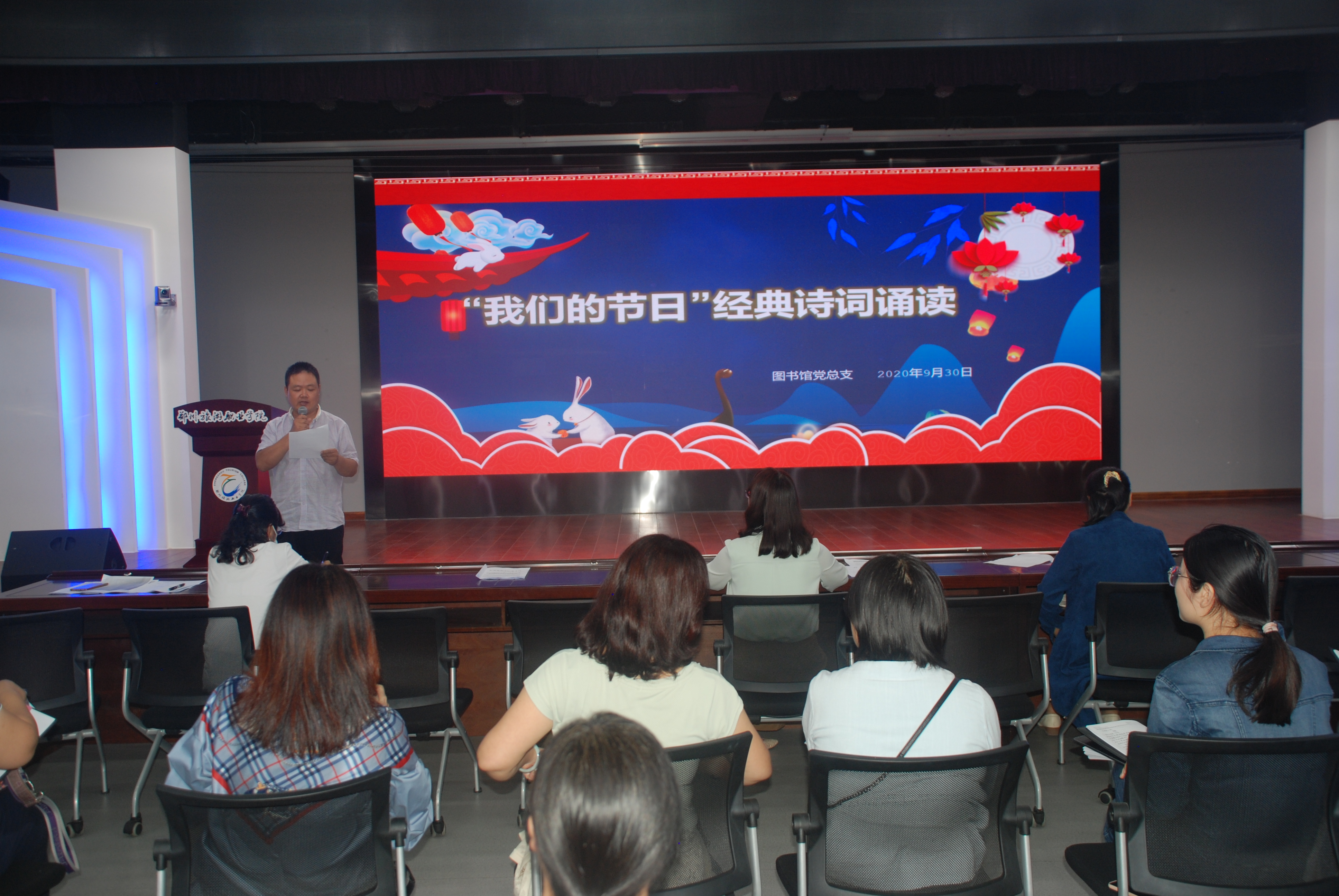 在国庆节、中秋节双节来临之际,为大力弘扬社会主义核心价值观、传承中华传统文化,2020年9月30日下午,图书馆党总支组织图书馆、信息网络中心全体教职工在综合楼B座4楼演播中心举办了“我们的节日”经典诵读活动。