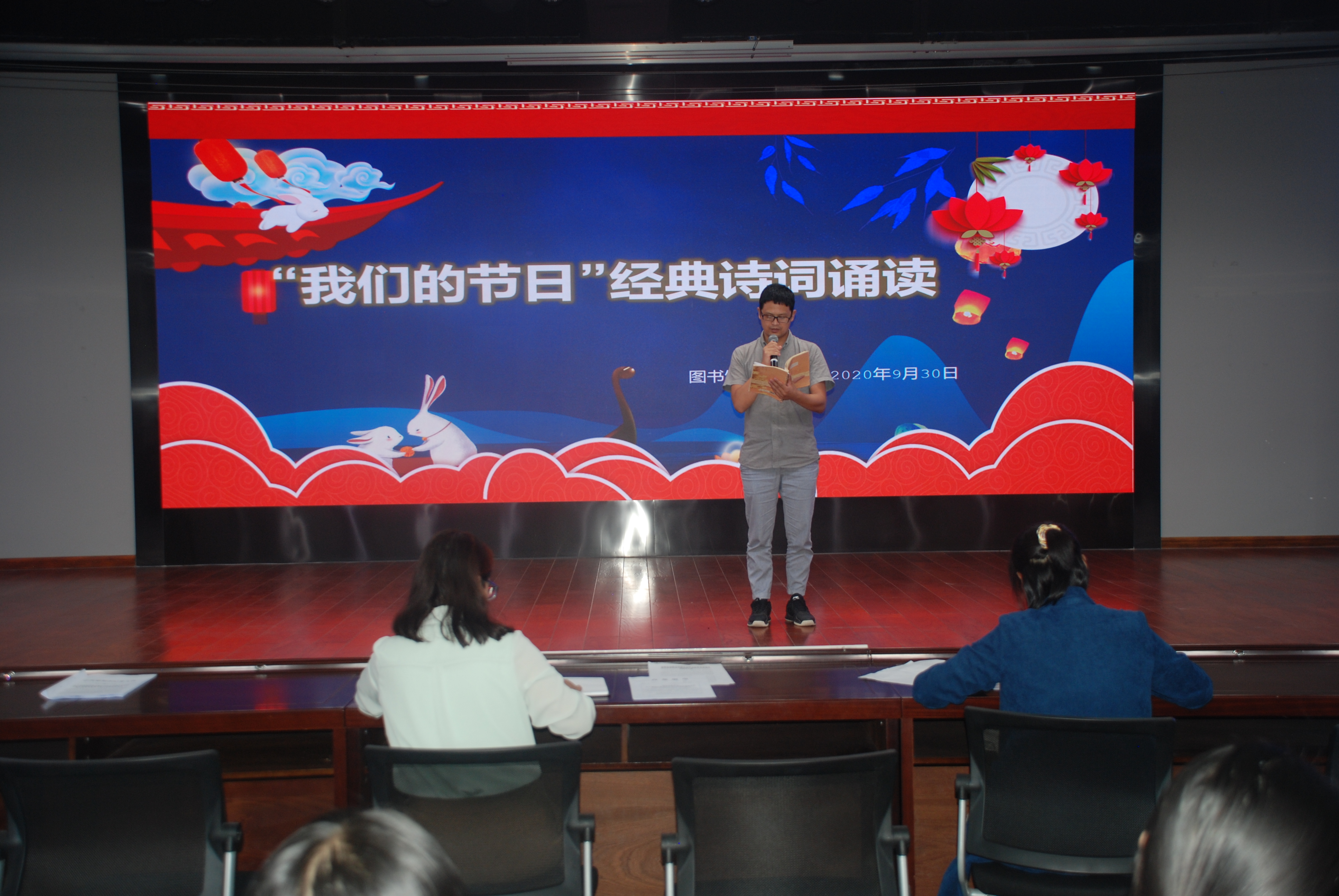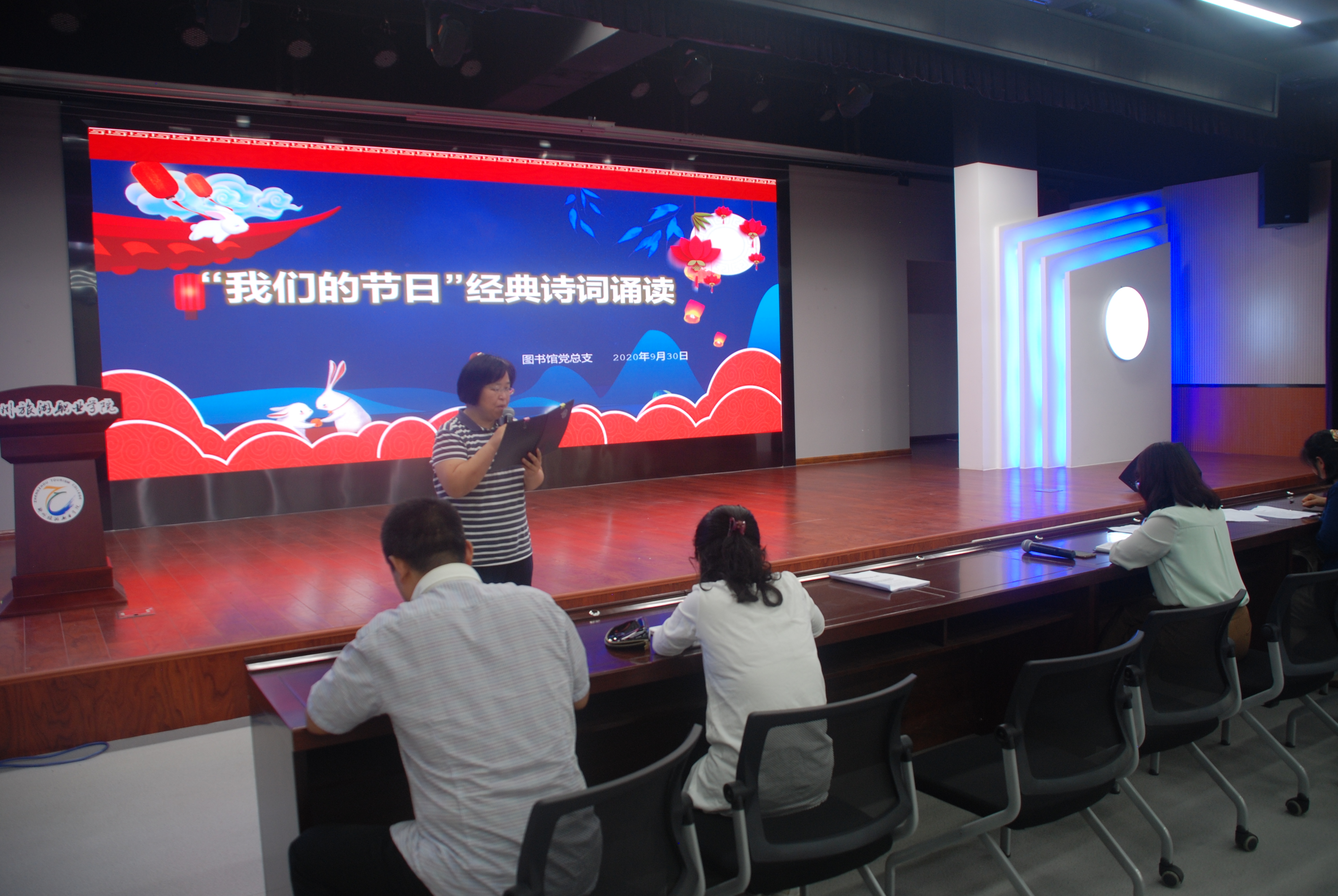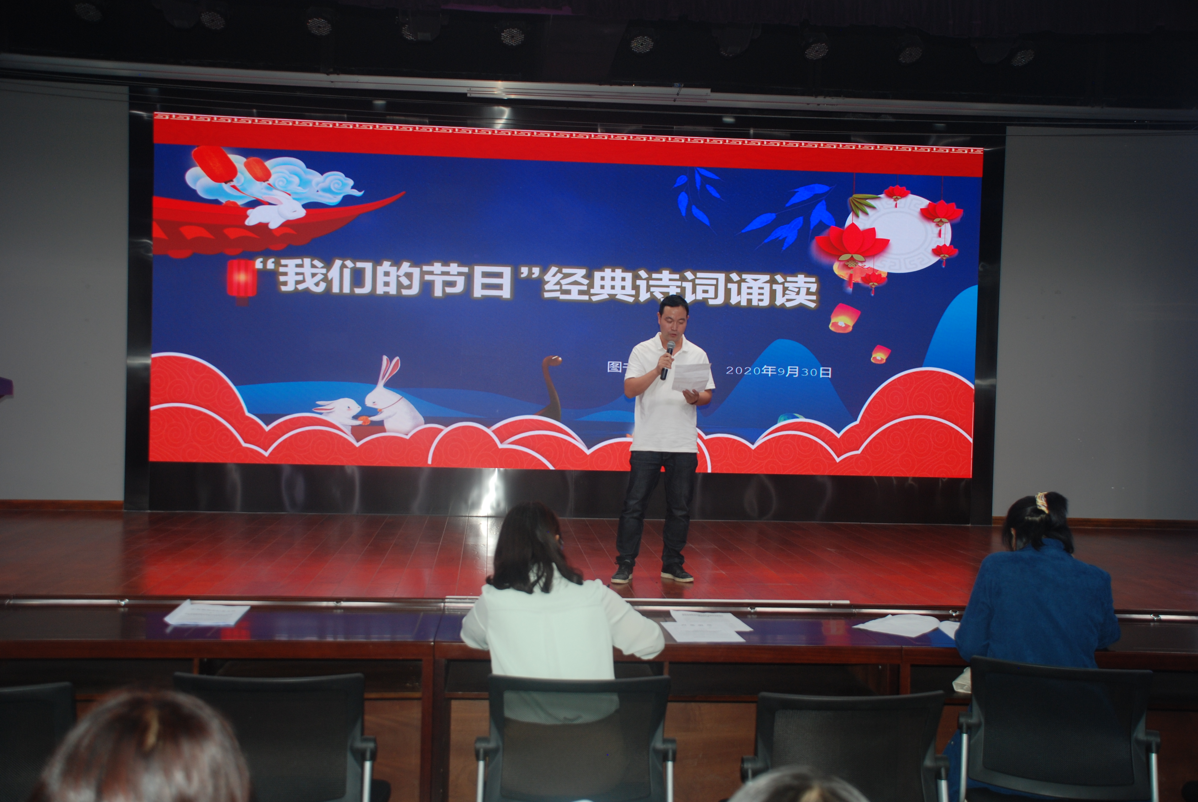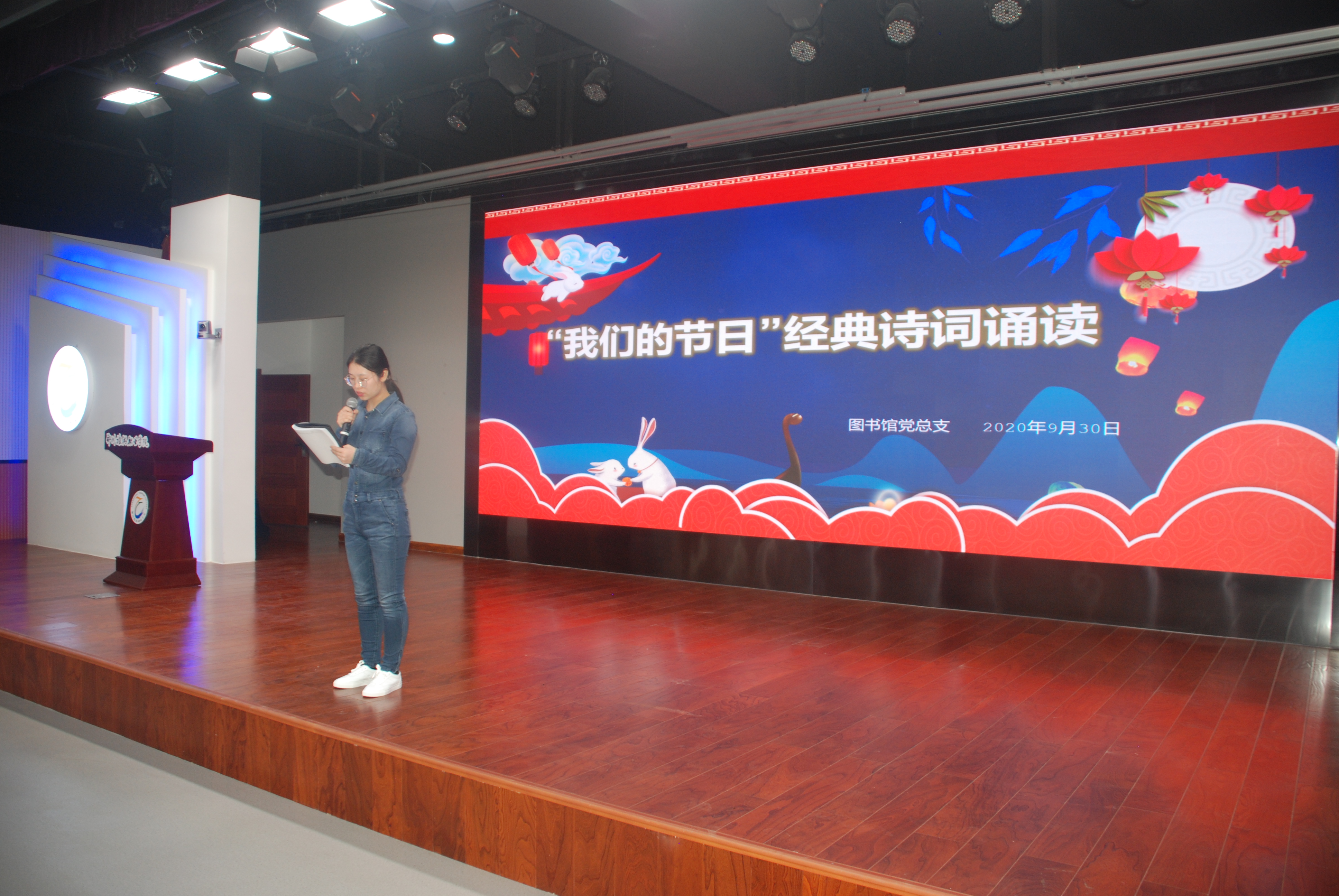 在国庆节、中秋节双节来临之际,为大力弘扬社会主义核心价值观、传承中华传统文化,2020年9月30日下午,图书馆党总支组织图书馆、信息网络中心全体教职工在综合楼B座4楼演播中心举办了“我们的节日”经典诵读活动。