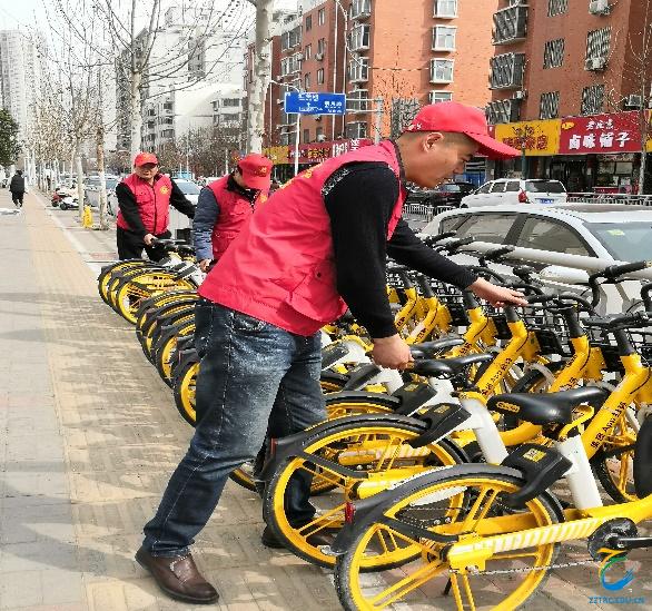 在“整理共享单车“活动中,志愿者们动手将凌乱的自行车摆放整齐,用实际行动向过往的行人展示了维护单车环境、提高自身素质的重要性。