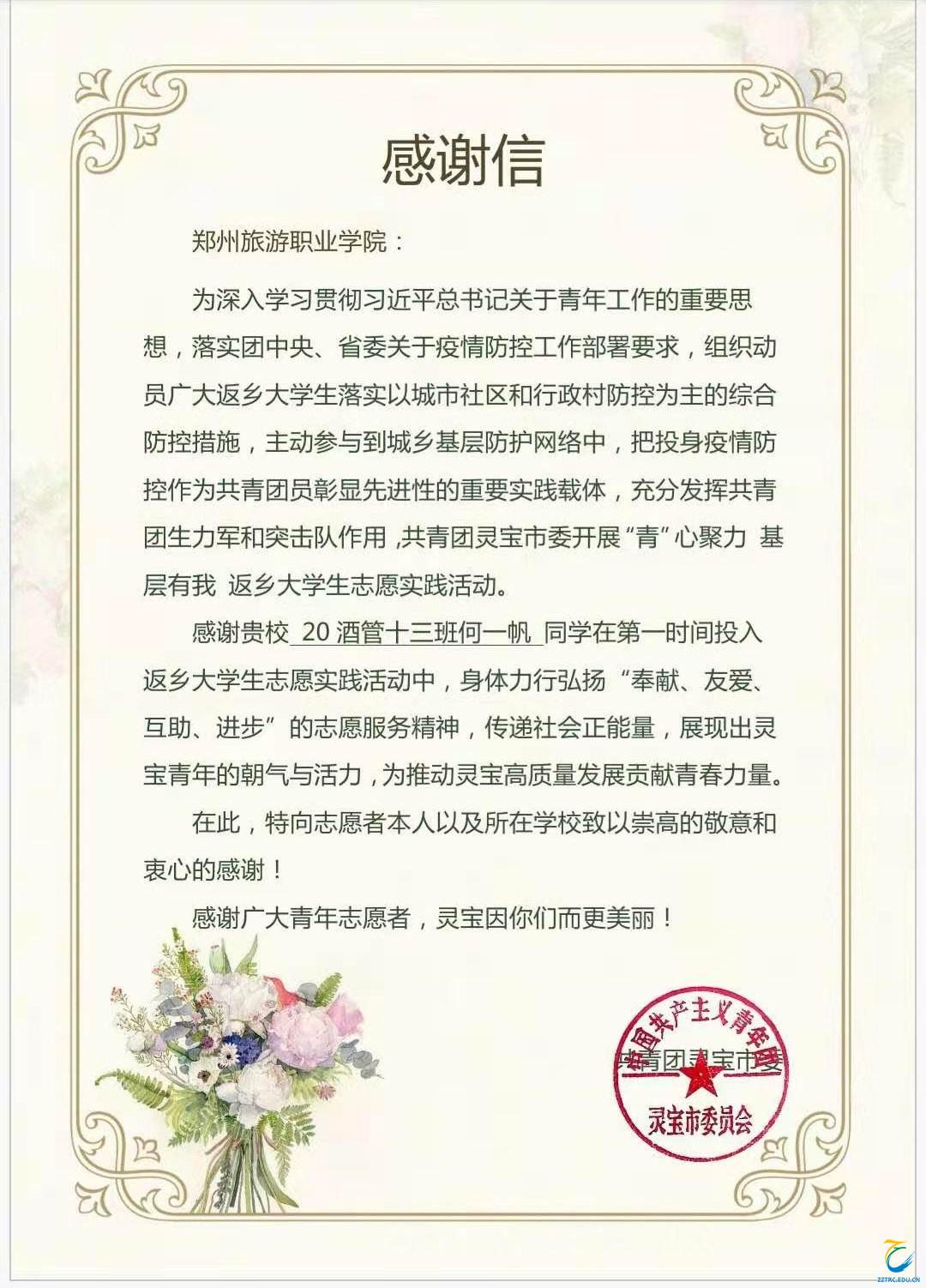 感谢信中说,“感谢贵校 20 酒管十三班何一帆同学在第一时间投入返乡大学生志愿实践活动中,身体力行弘扬“奉献、友爱、互助、进步”的志愿服务精神,传递社会正能量,展现出灵宝青年的朝气与活力,为推动灵宝高质量发展贡献青春力量。在此,特向志愿者本人以及所在学校致以崇高的敬意和衷心的感谢!”