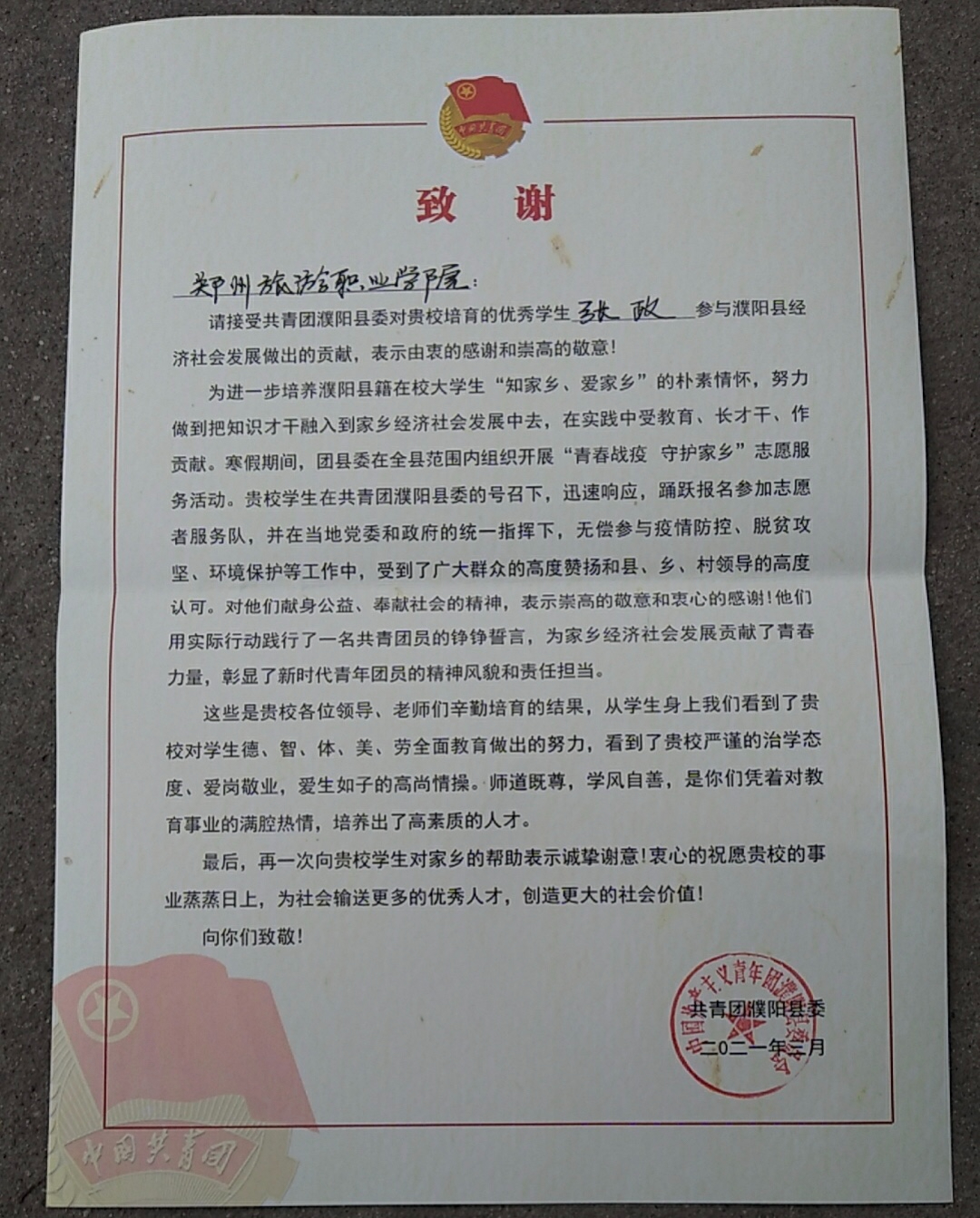 请接受共青团濮阳县委对贵校培育的优秀学生张政参与濮阳县经济社会发展做出的贡献,表示由衷的感谢和崇高的敬意!