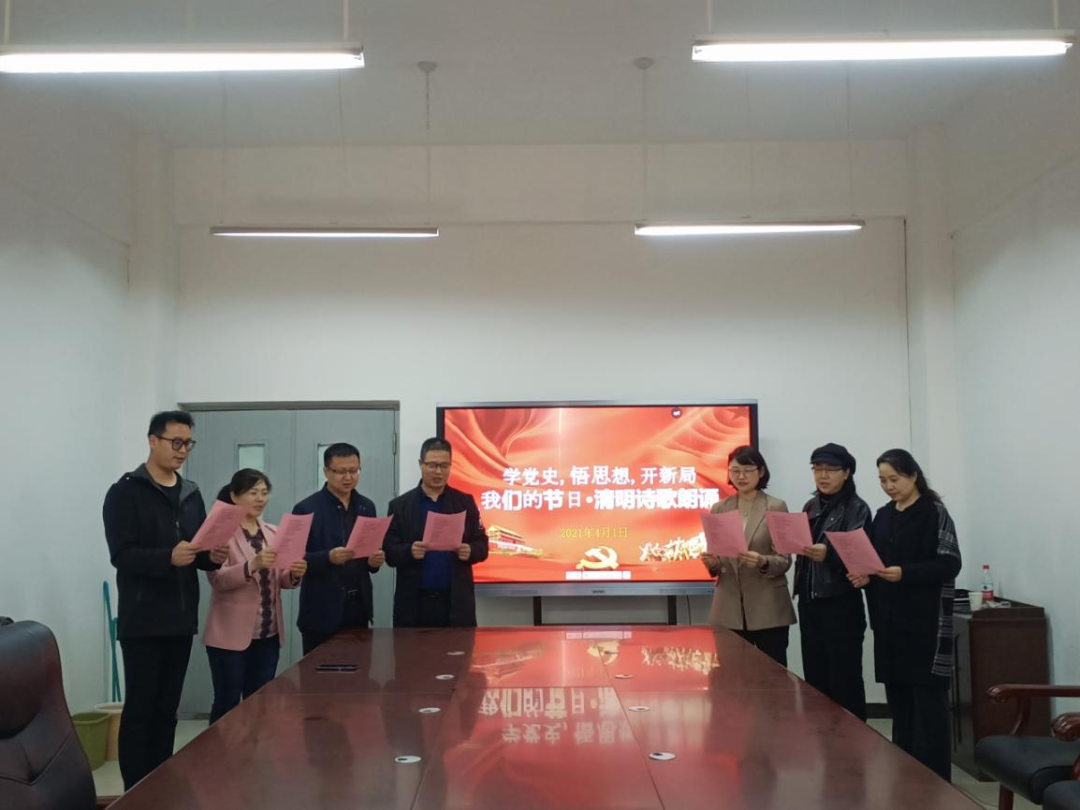 学院领导班子成员及行政人员在学院会议室举行诗歌朗诵会。党总支书记秦合岗领学党章。院长李俊强调,在“十四五”开局之年,全体干部要发扬为民服务、创新发展、艰苦奋斗的精神,忠实履职,扎实工作,以优异成绩庆祝中国共产党成立一百周年。接下来参会人员集体朗诵《清明祭烈士陵》、《清明》、《有的人》等经典诗文,以诗歌缅怀革命先烈,弘扬革命精神和光荣传统。