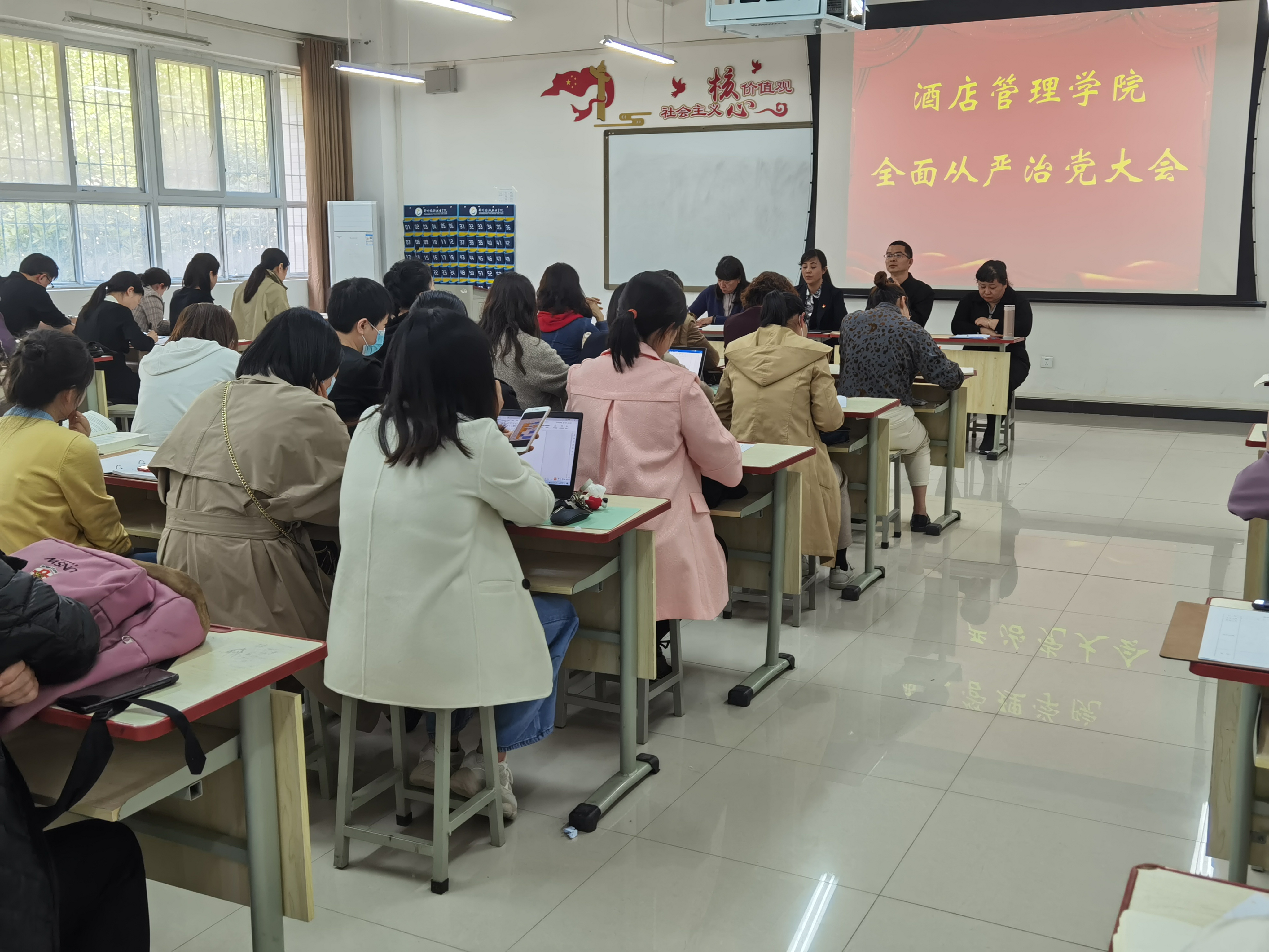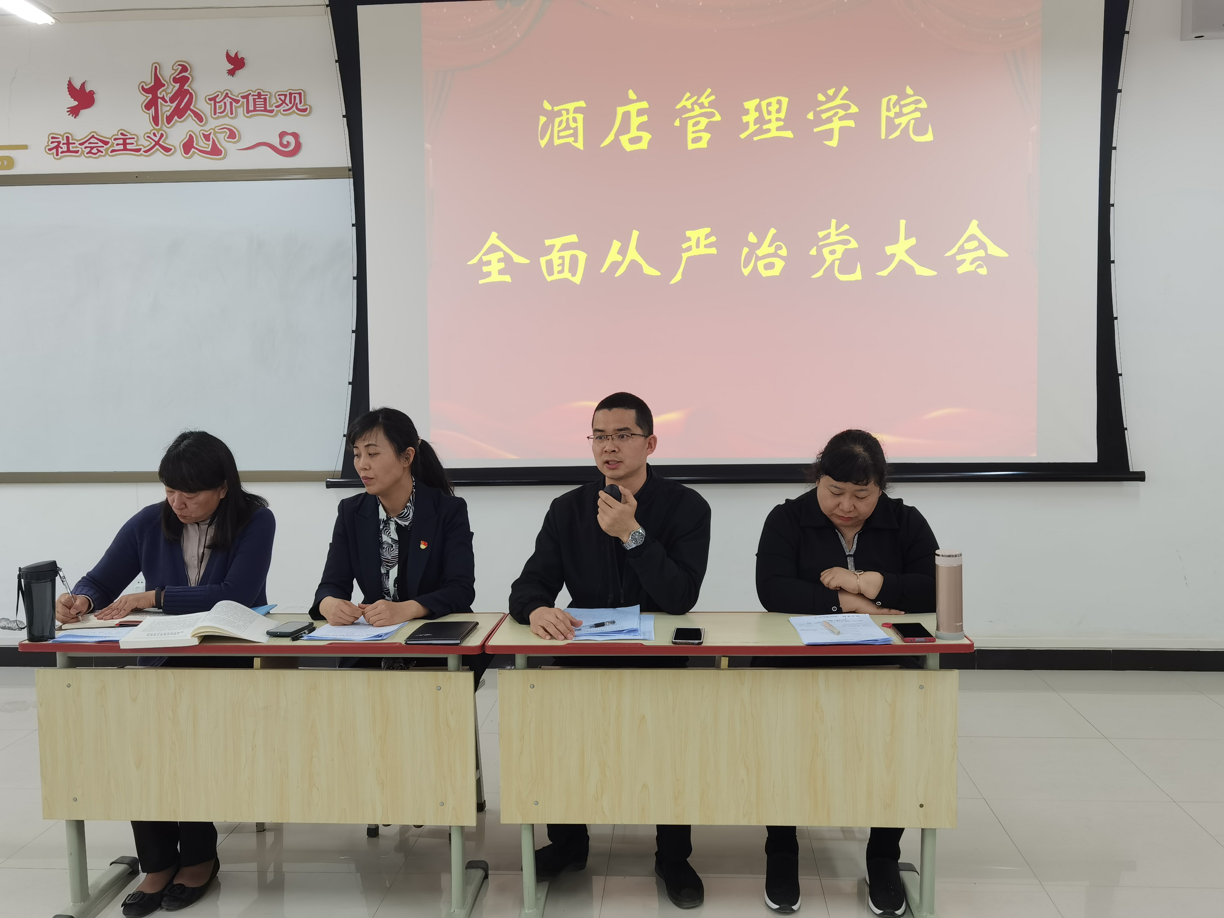 4月19日,酒店管理学院在2B102会议室召开全面从严治党工作会议,党总支书记陈海彬、院长肖靖、副院长钱丽娟、副院长周崴及全体教师参加了会议,会议由陈海彬主持。