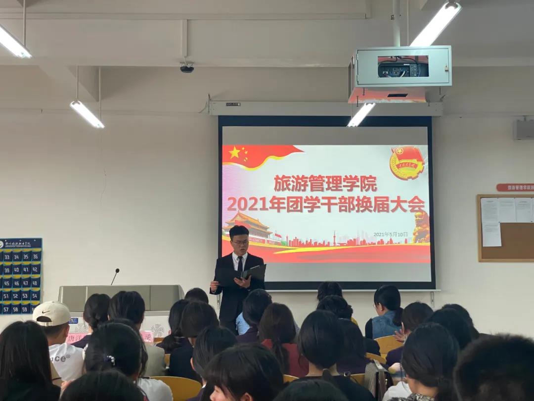 2021年5月10日下午,旅游管理学院2021年团学干部换届大会在5A502教室顺利召开。学院团总支书记金慧慧和全体辅导员老师出席大会,新老团学干部、各班学生代表参加本次大会。大会由学生会副主席蔡旭阳主持。