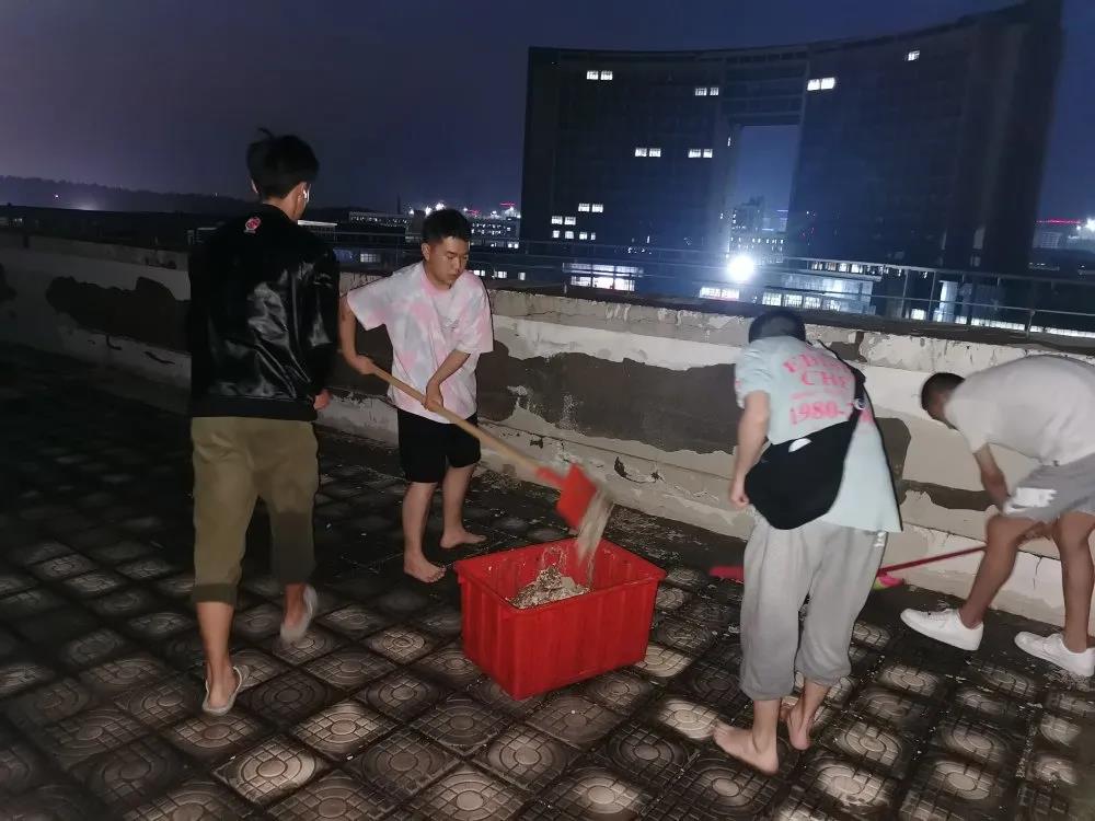 旅游外语学院辅导员兼安全管理员沈晋旭老师,为保证学生安全,第一时间安排有序疏散正在上晚自习的同学们。同时组织郭懿慷、齐赛、郭建钊、方武、赵贺、肖精干、王利康7名学生干部一起,带上简单的劳动工具,到4号教学楼排查安全隐患。排查过程中,沈老师发现旅游外语学院的4号B座教学楼楼顶的积水最深处已经没过脚踝。考虑到积水会引起楼顶渗水,直接影响到五楼琴房、舞蹈室、心理工作室等教室的设施设备,沈老师以身作则,率先脱下鞋子,赤脚淌在冰凉的水中,带领7名学生干部用手清理堵塞的淤泥和垃圾。由于工作量太大,纪律卫生部部长毛晨冰、副部长李宇及时召集了20级应用英语班、商英1班、德语班,日语2班、国际领队2班的同学们前来帮忙。在沈老师和大家的共同努力下,历经两个半小时,终于疏通了下水管道。检查和清理工作持续到晚上21时30分,4B教学楼楼顶、五楼西连廊顶,三楼平台,三楼东连廊的积水和淤泥已经全部清理完毕。