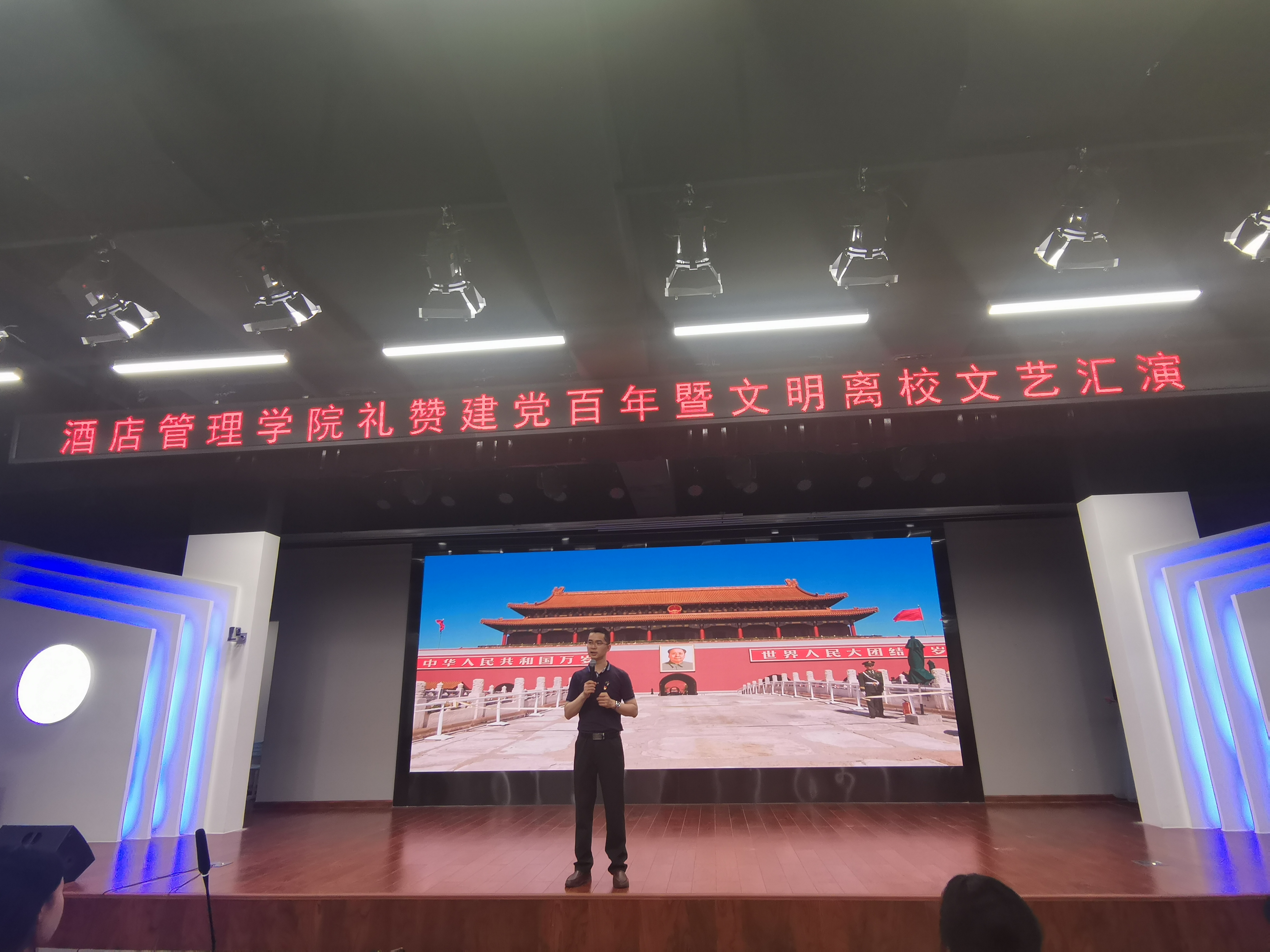 为庆祝建党100周年,弘扬红色文化,凝聚奋进力量,展示酒店管理学院学生的文明风采,丰富精神文明内涵,欢送19级学生文明离校。酒店管理学院于5月27日晚上在综合楼B座4楼演播厅举办礼赞建党百年暨文明离校文艺汇演。酒店管理学院党总支书记陈海彬出席了本次活动并发表讲话。